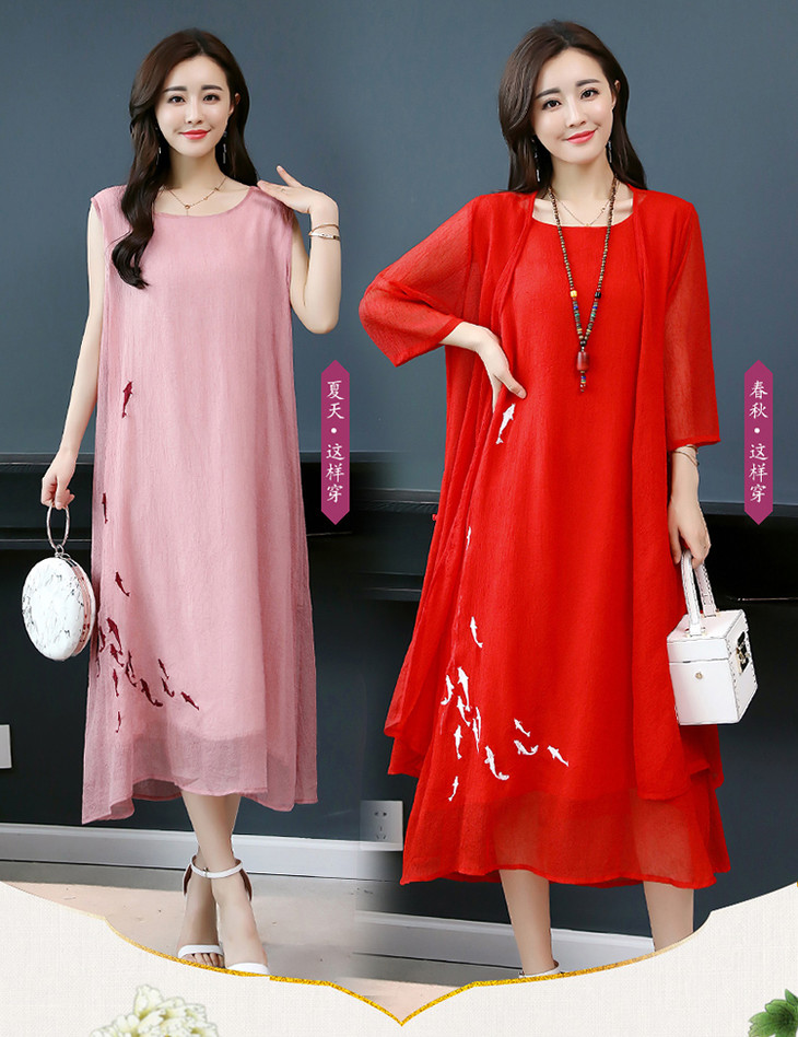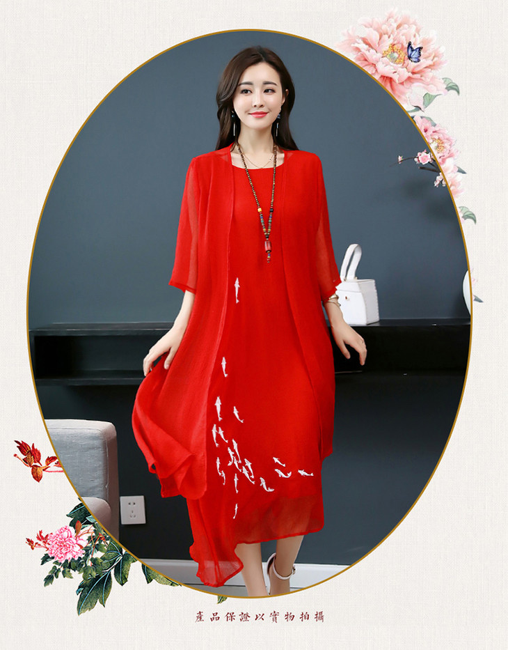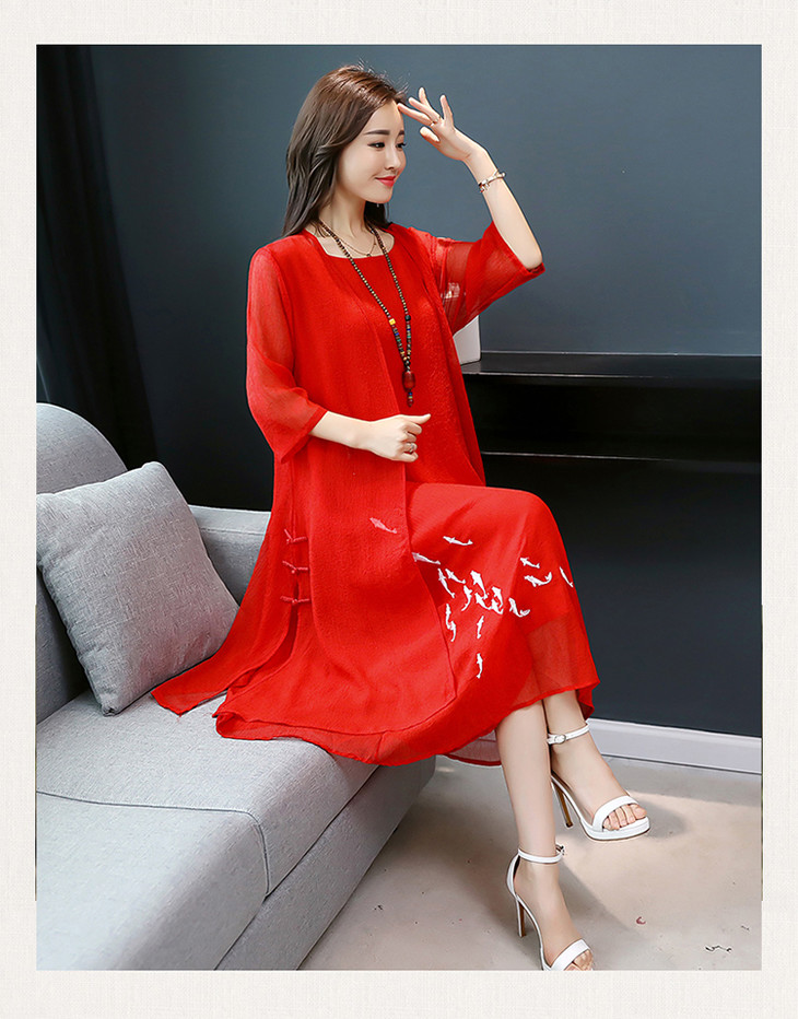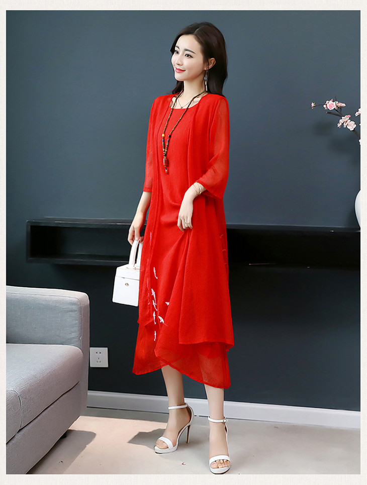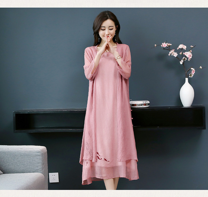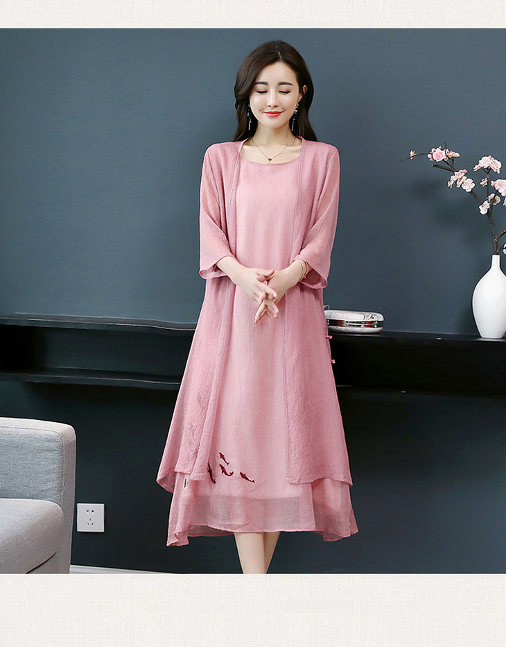 YGYL872 新款仿真丝盘扣刺绣复古文艺两件套连衣裙