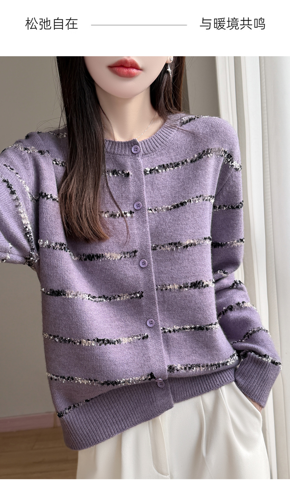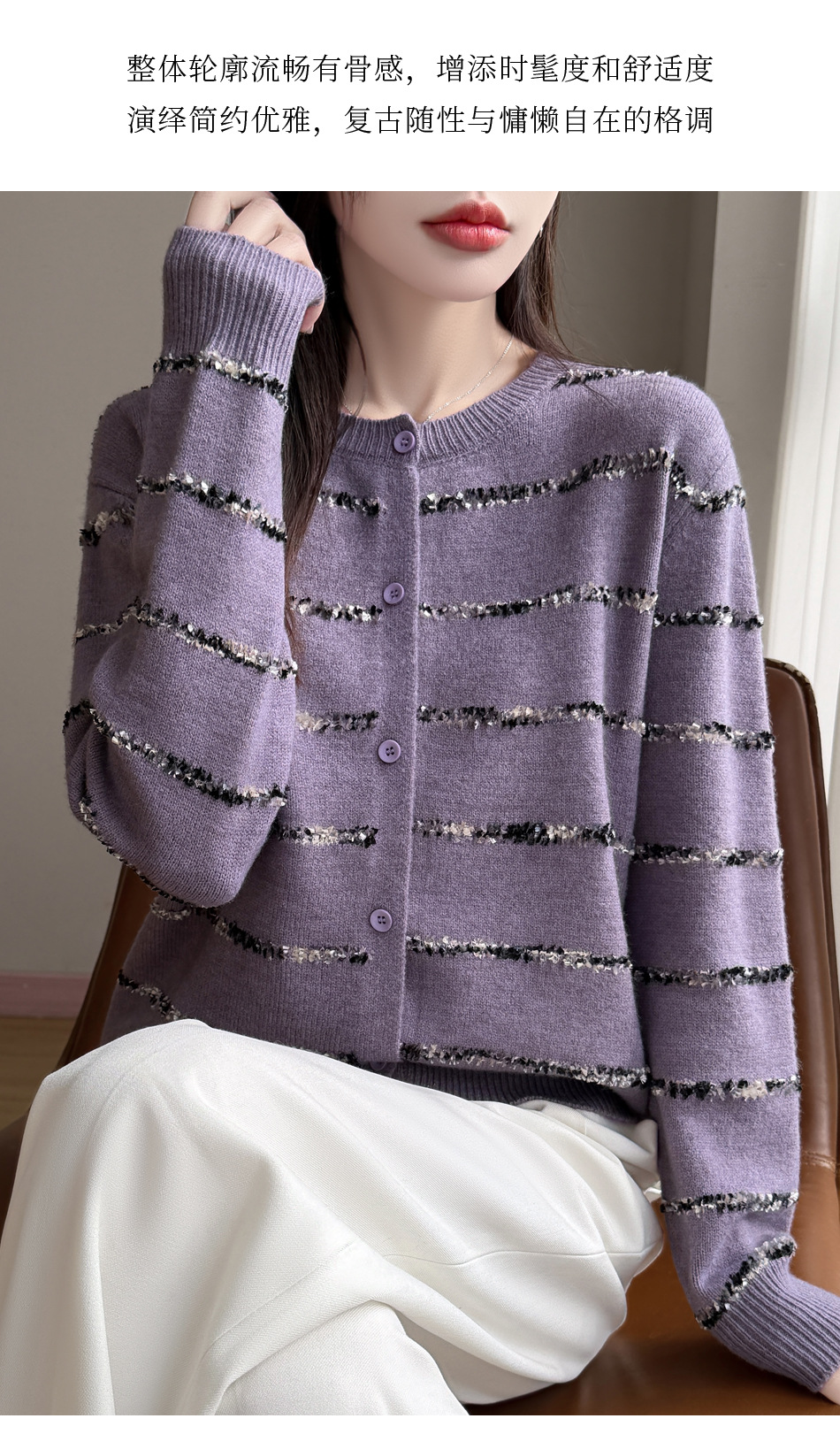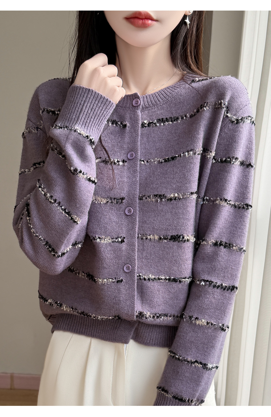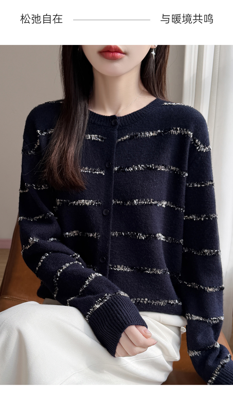 百媚生 小香风条纹薄款针织开衫纽扣毛衣NJR2-2188-37