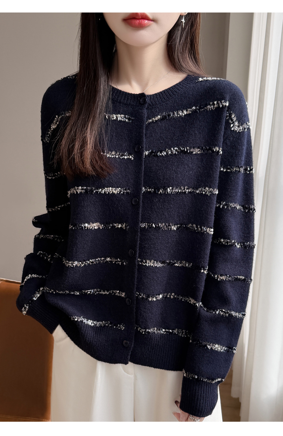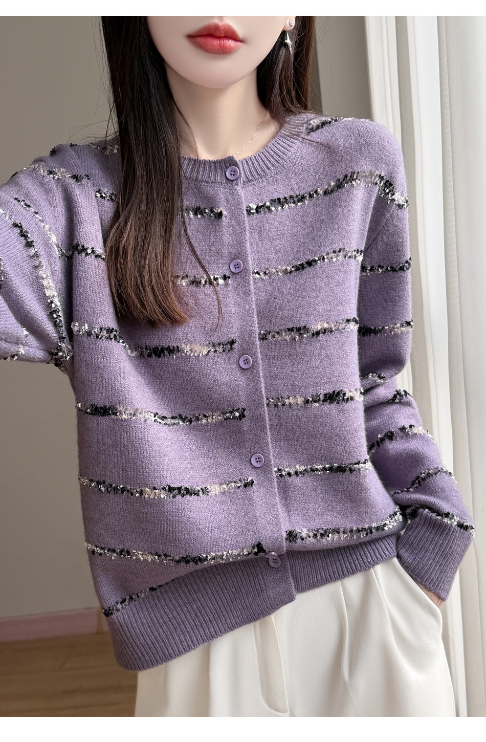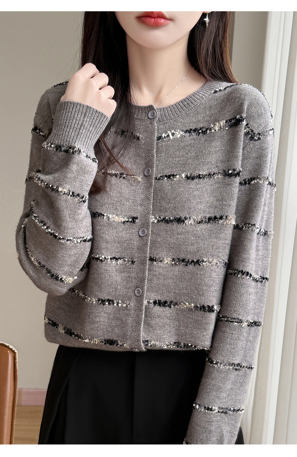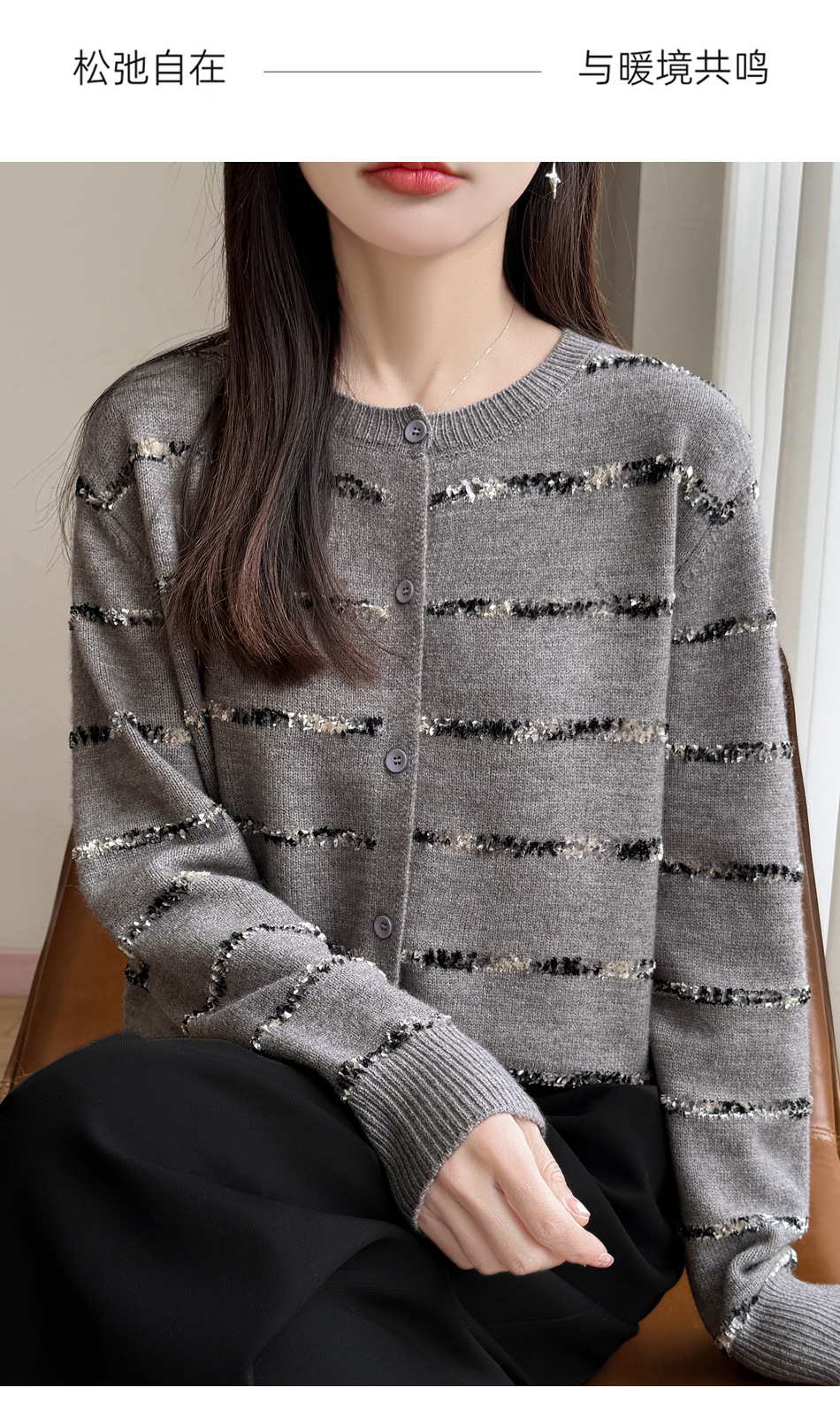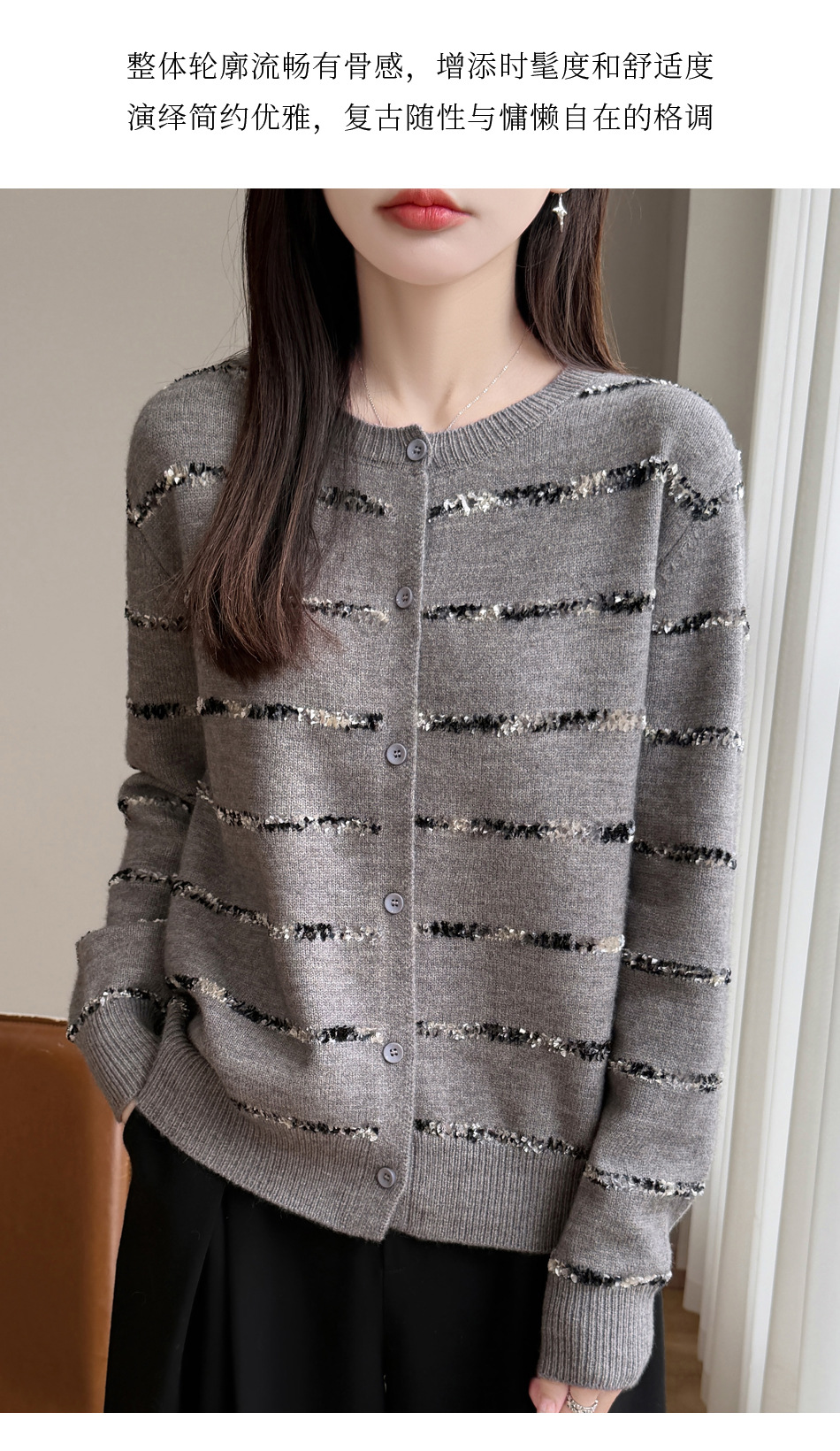 百媚生 小香风条纹薄款针织开衫纽扣毛衣NJR2-2188-37