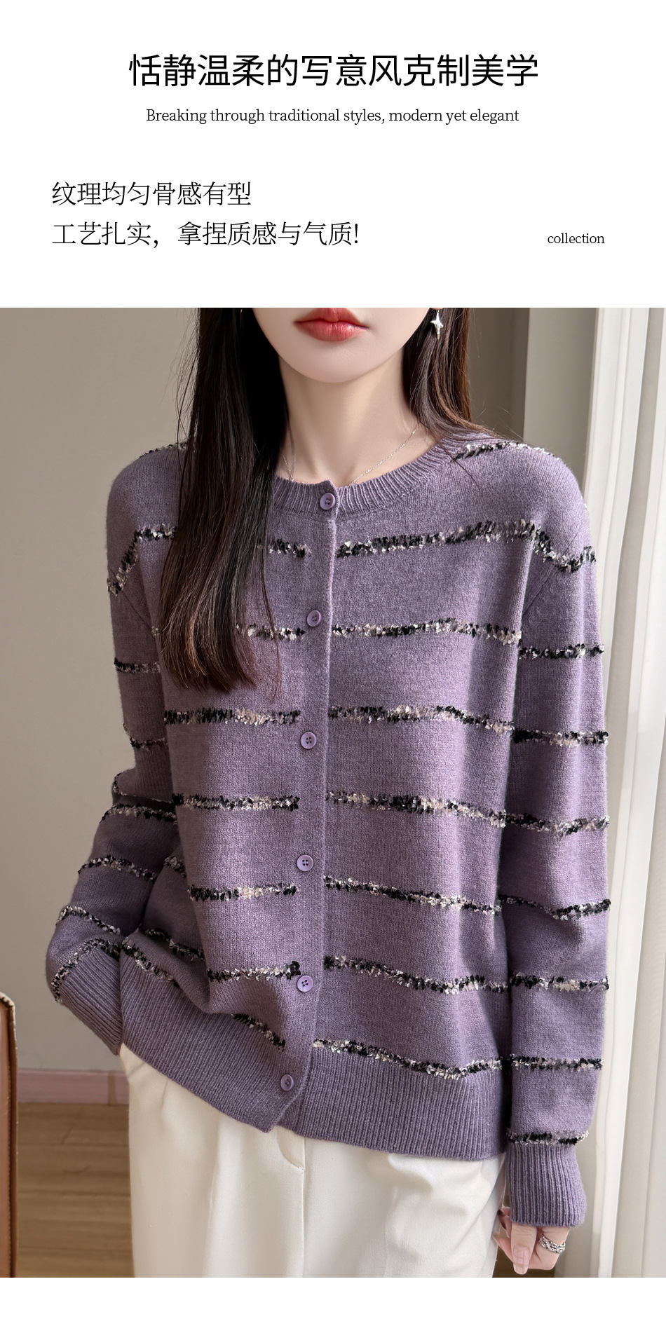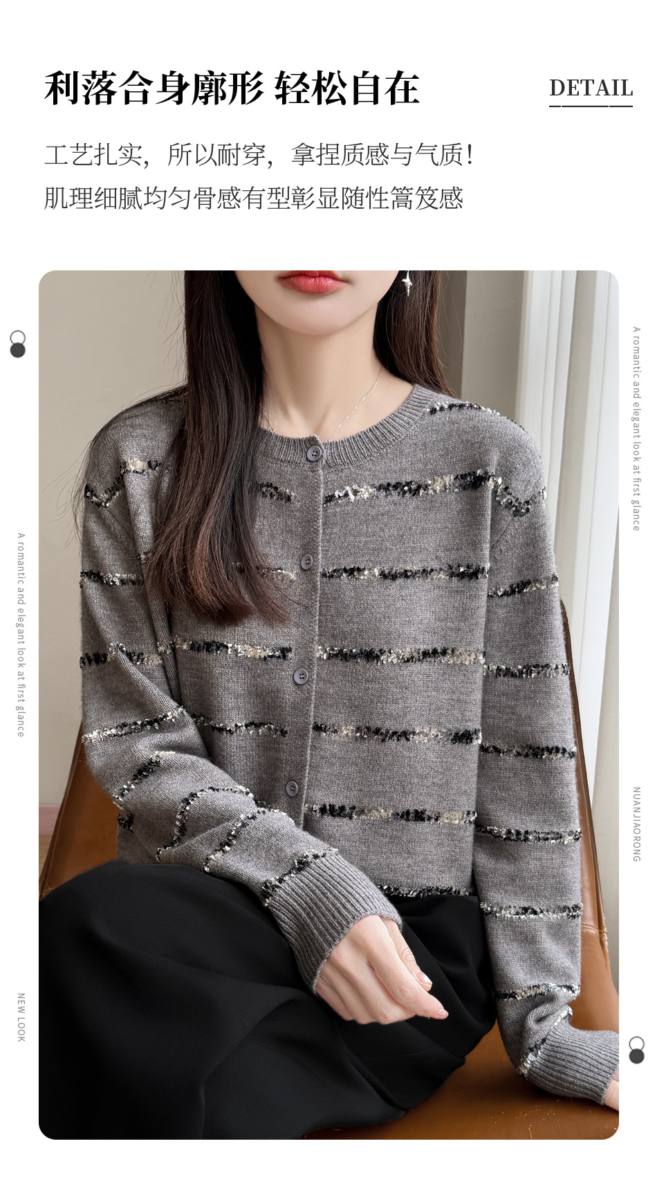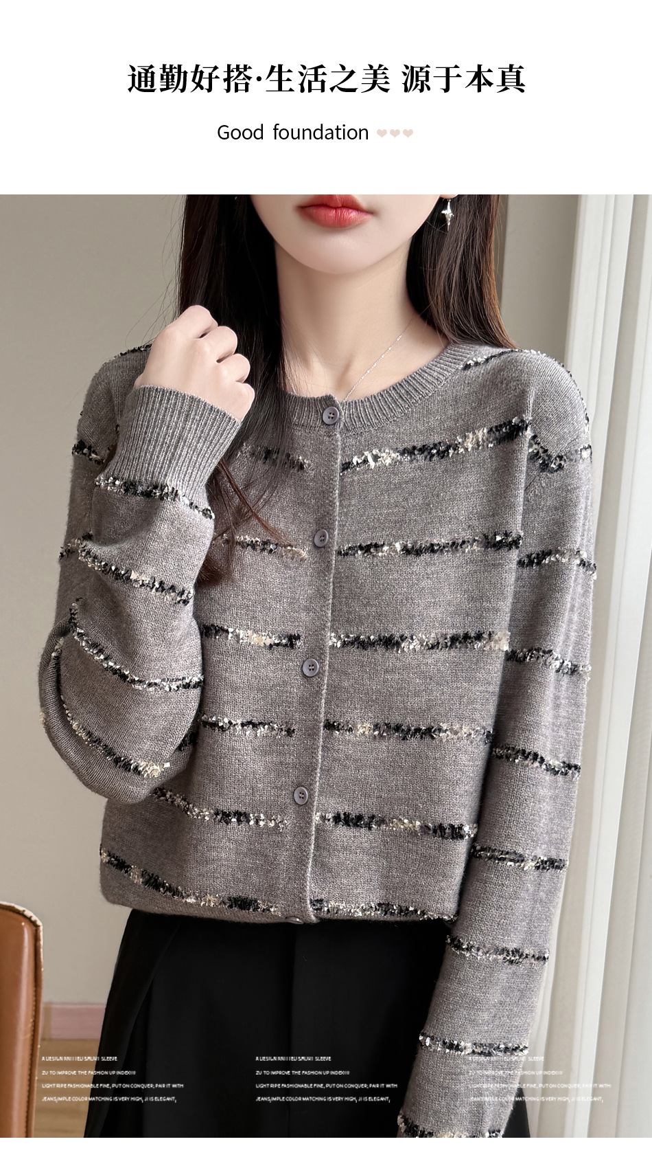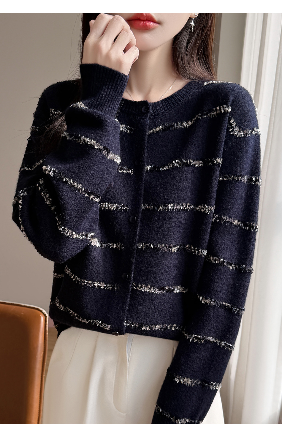百媚生 小香风条纹薄款针织开衫纽扣毛衣NJR2-2188-37