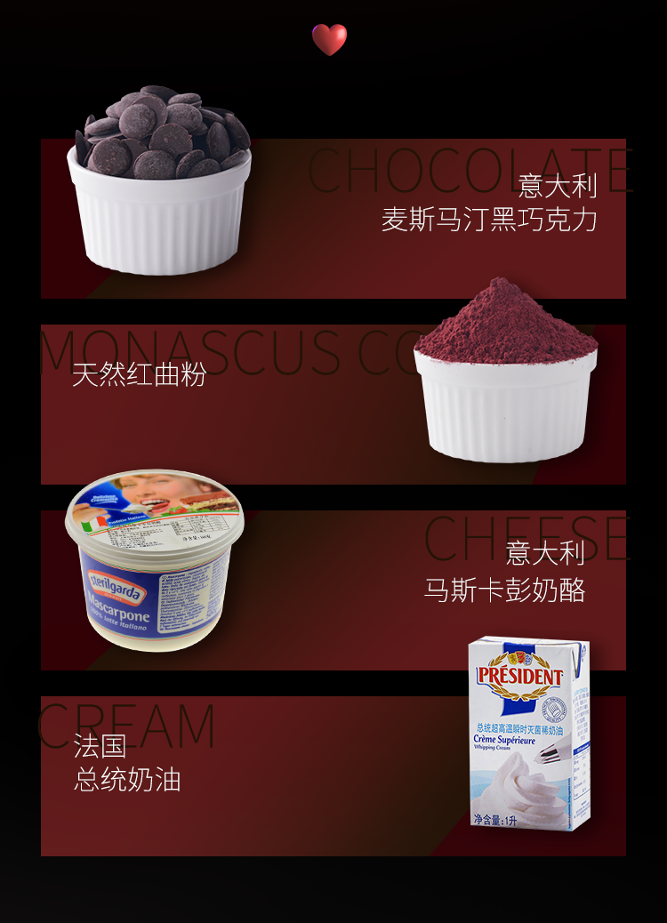 原材料好,甄选意大利马斯卡彭奶酪、法国天然动物奶油、麦斯马汀巧克力