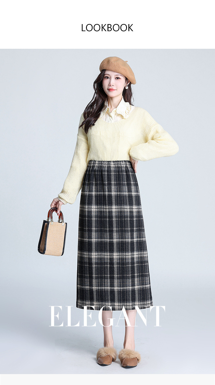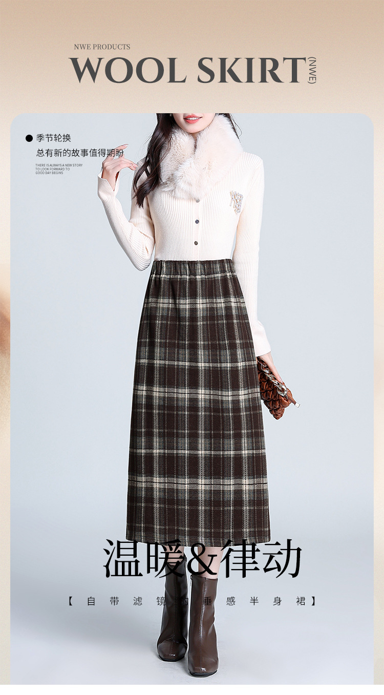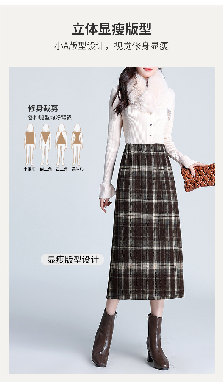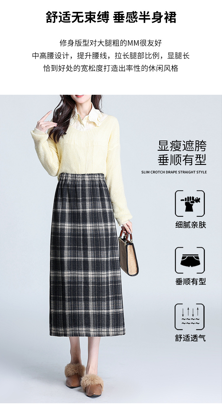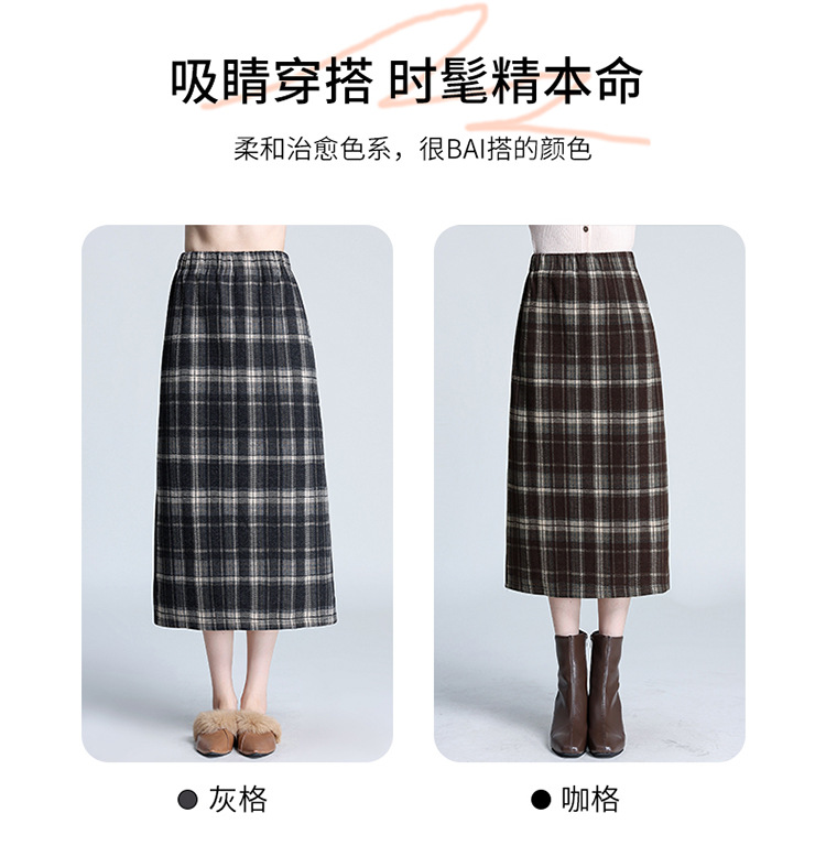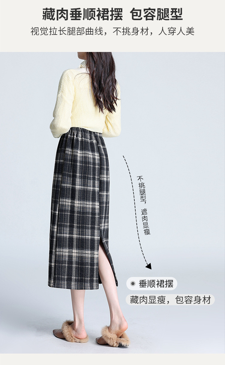 格纹中长款加绒毛呢包臀裙,冬款松紧腰通勤修身时尚半身裙MYX-23506