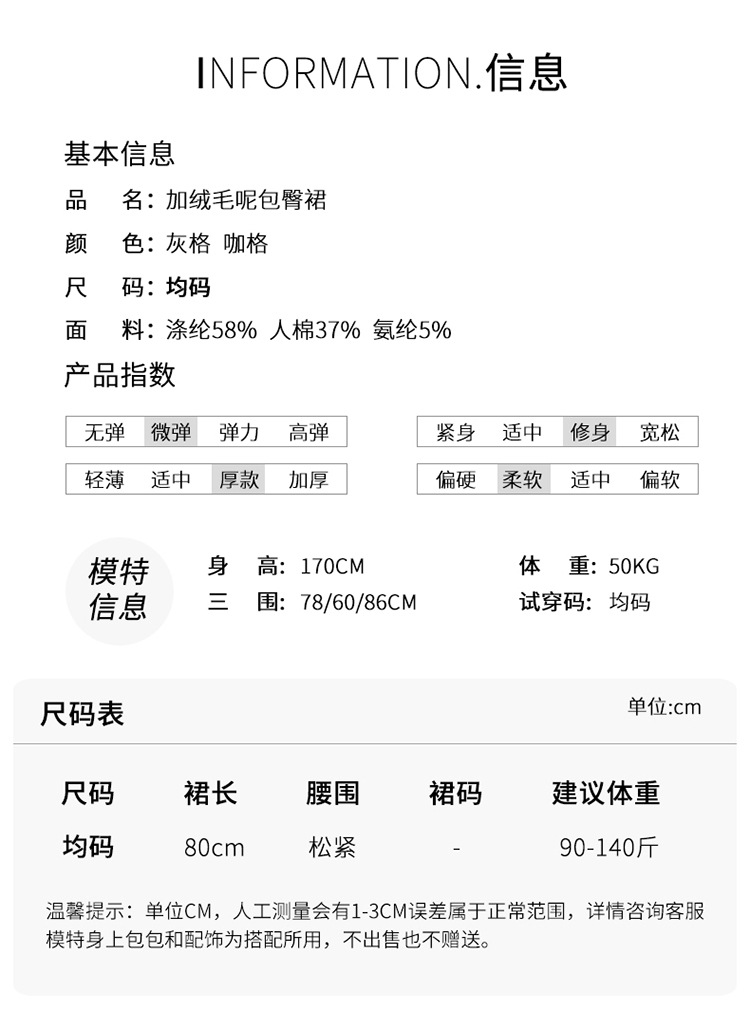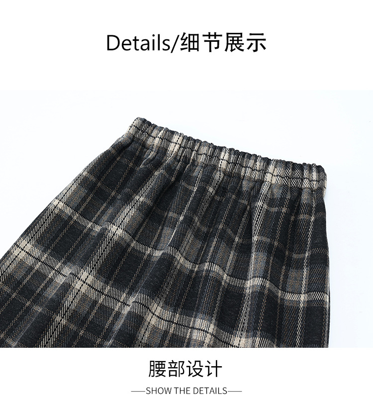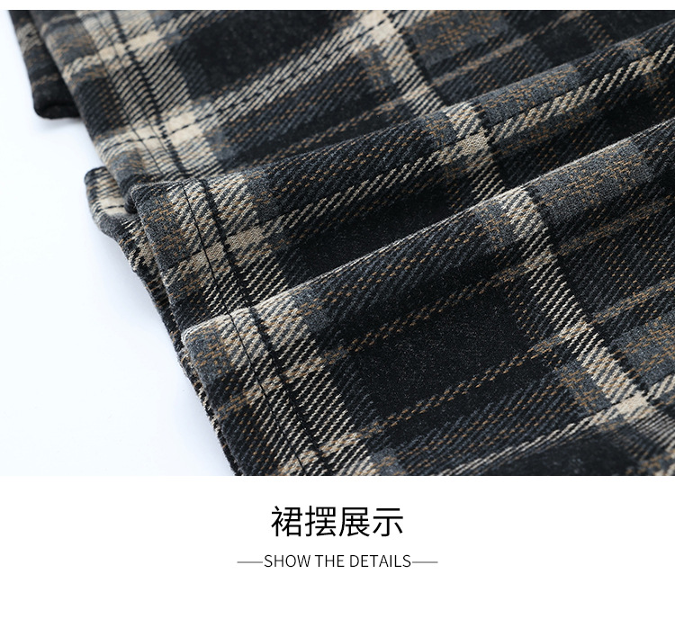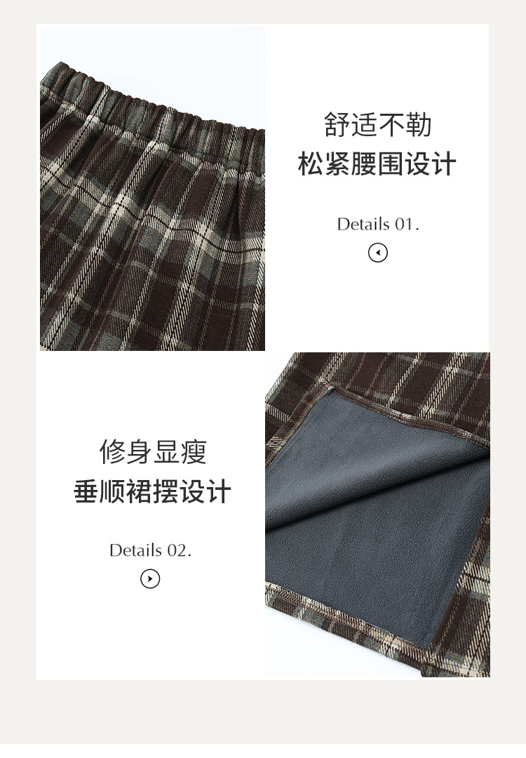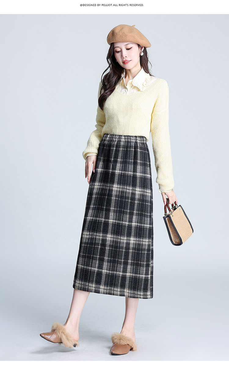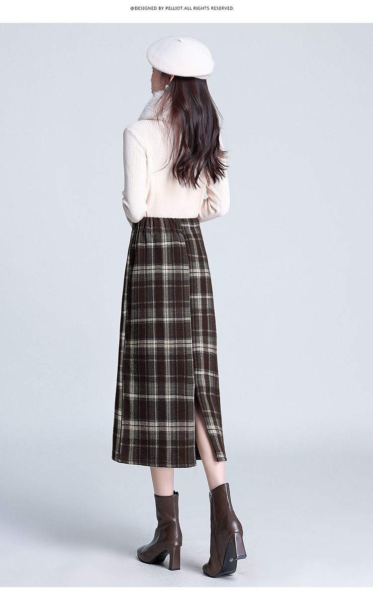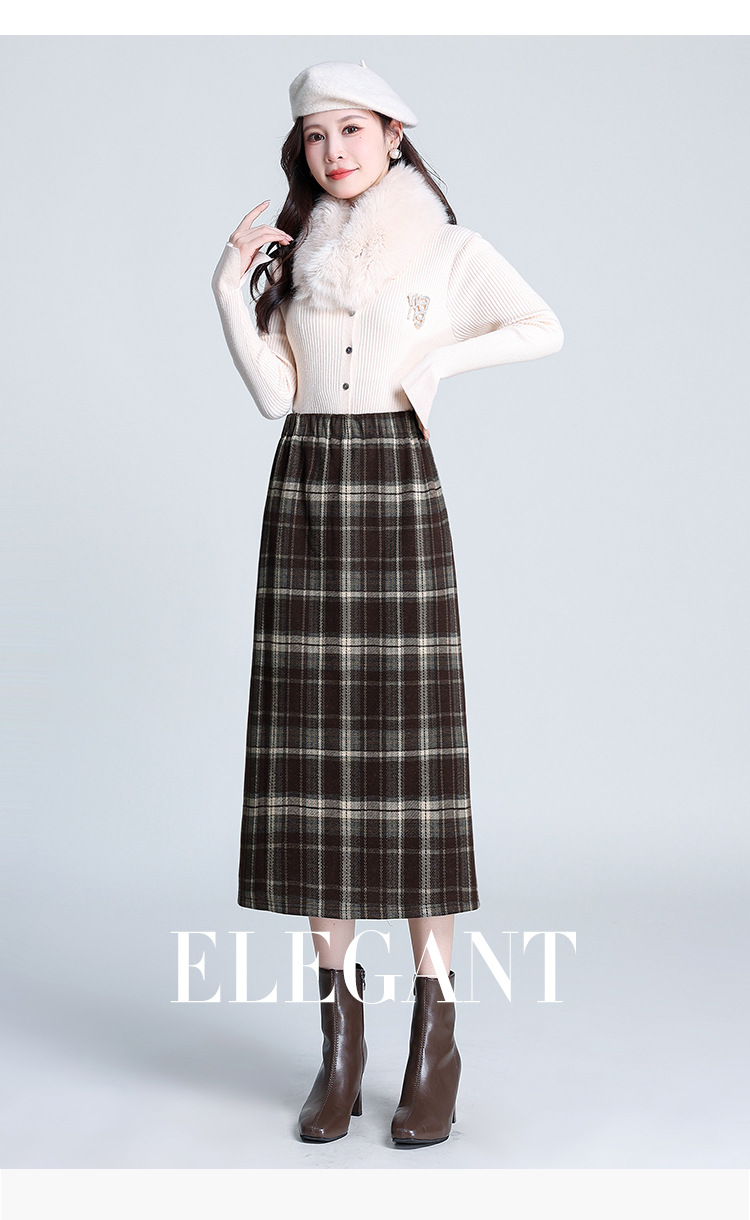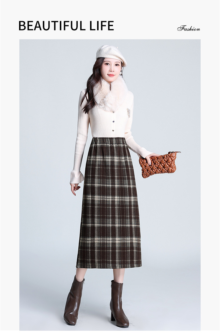 格纹中长款加绒毛呢包臀裙,冬款松紧腰通勤修身时尚半身裙MYX-23506