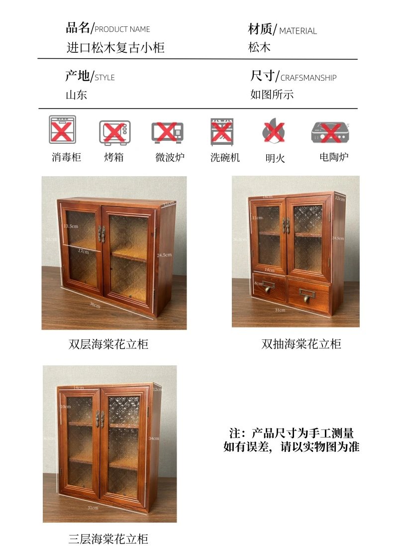 【产品名称】:进口松木复古小柜 【规格】:1:双层海棠花立柜 2:三层海棠花立柜 3:双抽海棠花立柜 【发货地区】:山东 【发货时间】:72小时内 【发货快递】:三通一达,极兔,邮政随机 【加运费地区】: 北京+5/单,上海+5/单,云南,贵州,四川 ,青海,海南,宁夏 ,甘肃,内蒙+10/单 【不发货地区】:新疆西藏 【售后保障】: 1、不支持7天无理由退货,介意者慎拍 2、质量问题请提供产品和快递面单合照【24小时】内和快递单【合影拍照】发给客服,单号必须【清晰可见】 3、快递发出后,不接受无理由拒收和拦截撤单改地址,介意者慎拍 4、因暴力快递造成的外包装瑕疵,不影响使用不在售后范围内。 5、个人喜好问题,不在售后范围内,由于显示屏与拍摄光线的不同,存在些许色差,产品颜色一律以收到实物为准,色差问题不在售后范围内,介意慎拍 【注意】 1.每个木制品木纹,色泽均有微少差异,木纹不规则等情况属于原木生长的正常现象 2.新的木制品,请先用清水洗或柔布擦拭。为了更长久地使用与保护,可用植物油擦涂木制品表面 3.避免长时间浸泡,避免用强力清洁剂,避免钢丝球等。请用摩擦力较低的布水洗擦拭,请尽量温柔对待 4.请尽量放置在阴凉通风处,避免暴晒,不要放置在高温炉具,电器旁 5.如因使用不当导致变形开裂,可抹植物油后晾干挽救 6.木制品的木材是有孔隙的,木材本身有色素,有轻微褪色属正常情况,是木材本身的颜色,不影响正常使用哦~(PS:柚木的情况会比较明显) 7.木制品一般会涂抹一层植物油来进行保养,并延长其使用寿命清洗后即可去掉多余油脂,不会影响正常使用