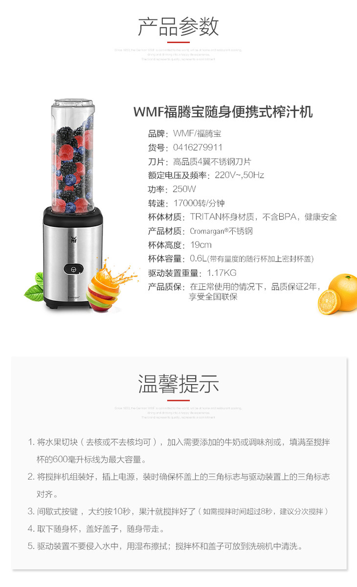 德国福腾宝WMF 0416279911家用便携式榨汁机搅拌机果汁机