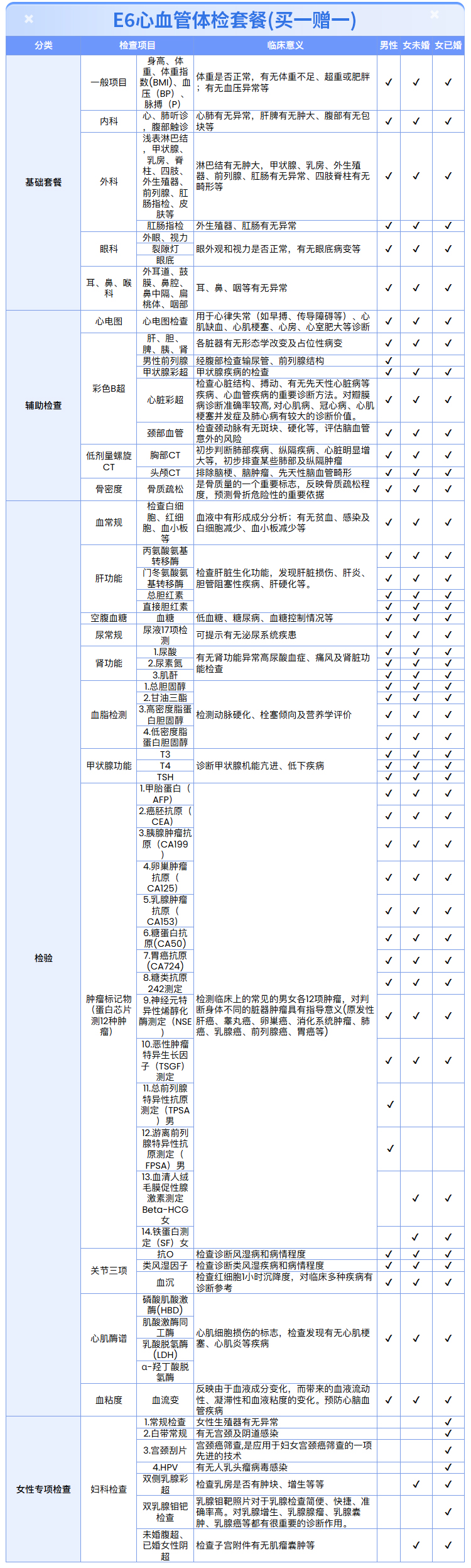 【双人体检|心脑血管专项】含胸部/头颅CT+九彩超+甲功三项+肿瘤十项+HPV(女)E6