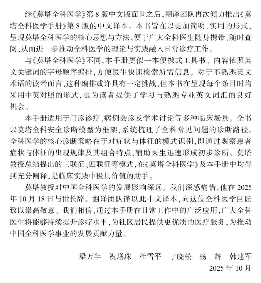 在此基础上推出的《莫塔全科医学手册》,以更加精炼、便携的形态,系统呈现了莫塔全科医学的核心思想与实践方法。手册保留了莫塔安全诊断模型的精髓,通过简明扼要的条目化呈现,将复杂的诊疗思维转化为易于随身携带、随时查阅的知识工具。它既是《莫塔全科医学》的精华浓缩版,更是一把将全科医学理论与实践深度融合的钥匙,旨在帮助广大全科医生在日常诊疗工作中,快速建立临床思路,提升诊疗效率与安全性。作为一本兼具理论高度与操作指南的案头工具,《莫塔全科医学手册》正在成为推动我国全科医学发展、提升基层医疗服务能力不可或缺的重要参考。