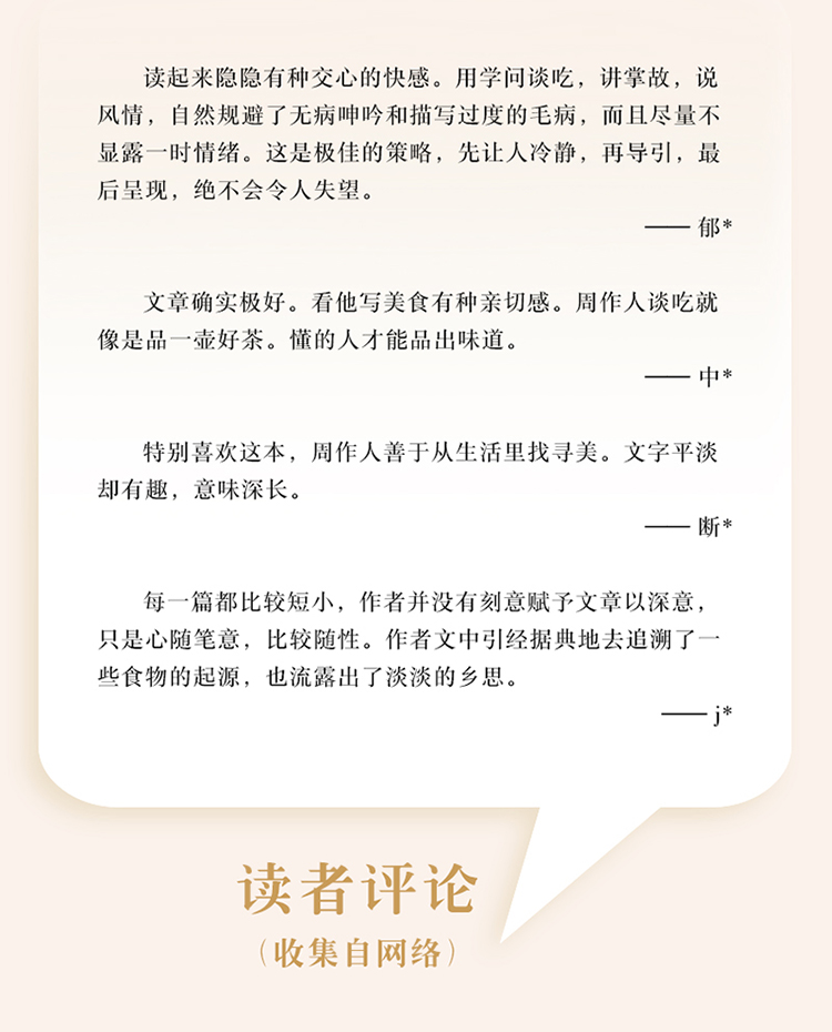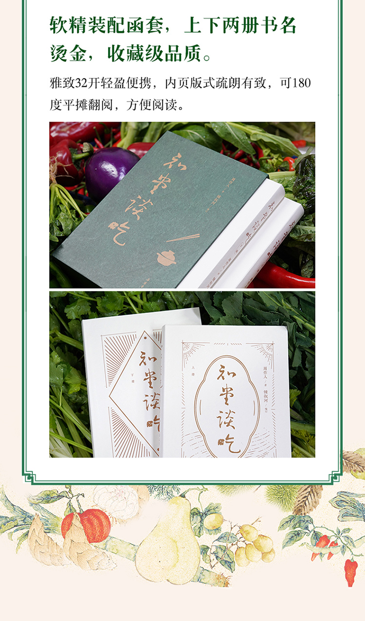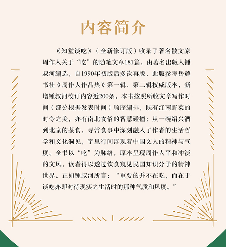 《知堂谈吃》为现代著名散文家周作人所作关于吃食的文章的结集,由著名出版人锺叔河先生编选。自1990年初版,2005年再版,并多次重印。“民以食为天”,名家的笔下所流淌出来的文字,让我们领略的不仅是食物本身,还有食物背后的知识和精神。正如编选者锺叔河先生所言:“谈吃也好,听谈吃也好,重要的不在吃,而在于谈吃亦即对待现实之生活时的那种气质和风度。”今本《知堂谈吃》较之前两个版本文章有了大量的增补,由九十四篇增加到一百三十九篇,以文章发表时间为序排列。