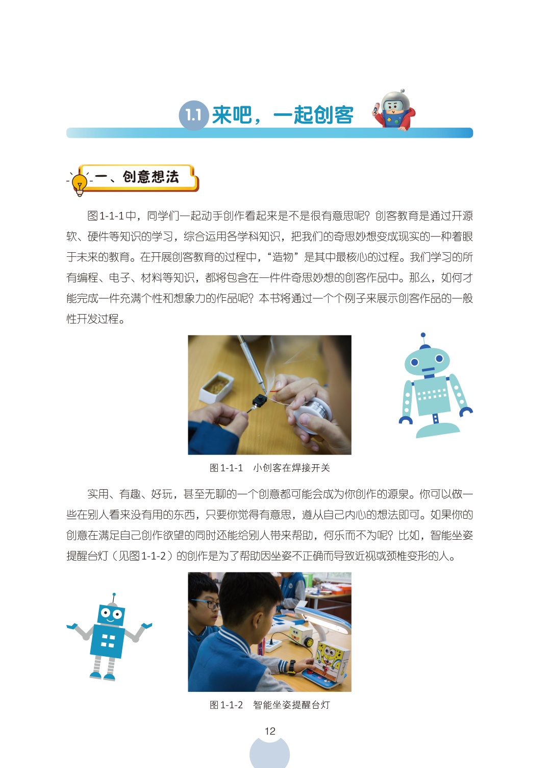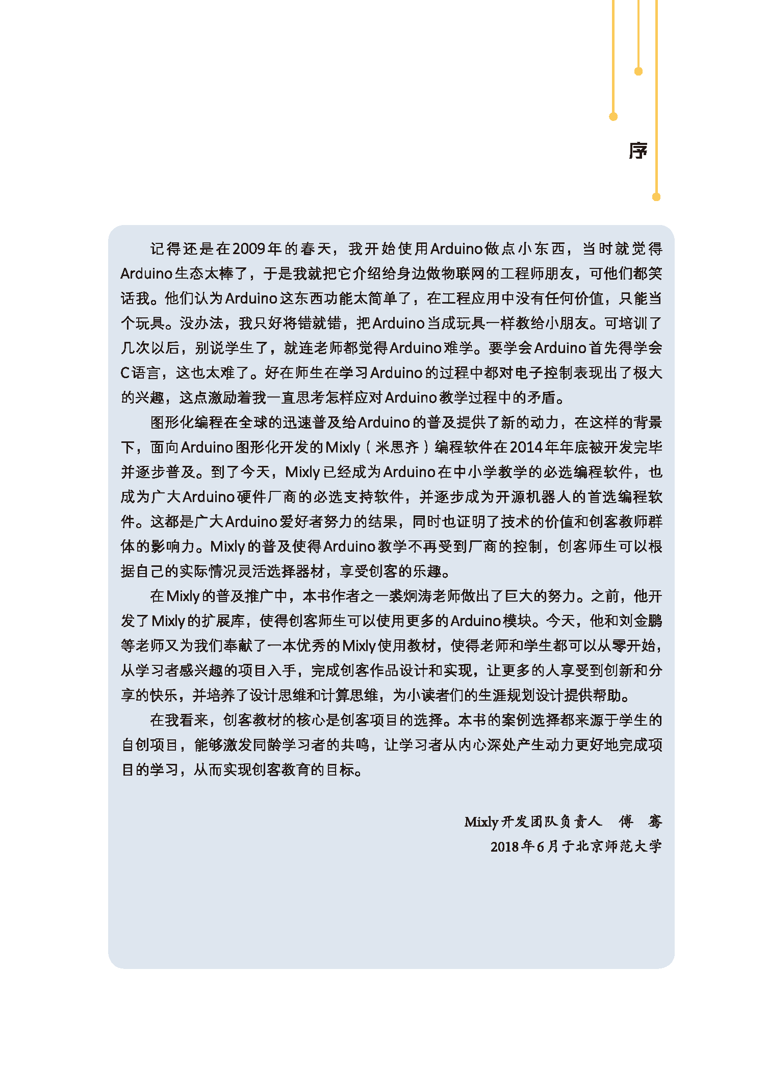 创客教育的核心是"造物” 和"分享”。在创客教育中,孩子们会综合运用各学科知识,历经创意、设计、制作、编程、分享等动手实践过程。而这其中,创客作品是创客教育中非常重要的载体。创客作品一般由结构(材料人电子(传感器人编程三大部分组成。如何选择材料、搭建电路、编写程序是创客作品设计中要解决的三个重要问题。本书将在这些方面给出探索,以期给开展创客教育的学校及实践作品制作的孩子提供一些思路和具体的方法。