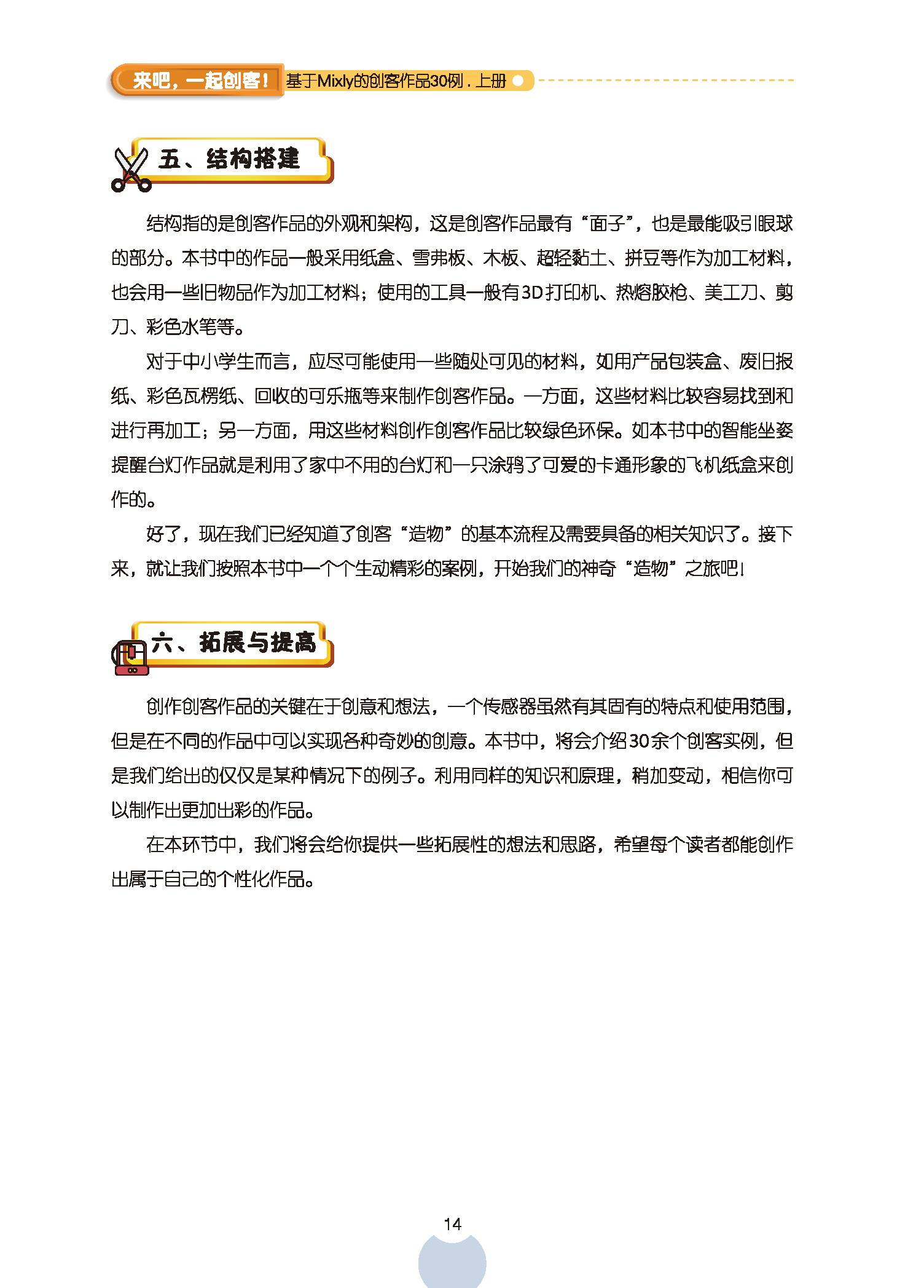 本书每一课的内容按照作品制作流程包含了创意想法、任务描述、搭建电路、编写程序及结构搭建五个部分,最后加上适当的拓展与提高的内容。读者可以在阅读的过程中动手创作,最终完成属于自己的个性化作品。