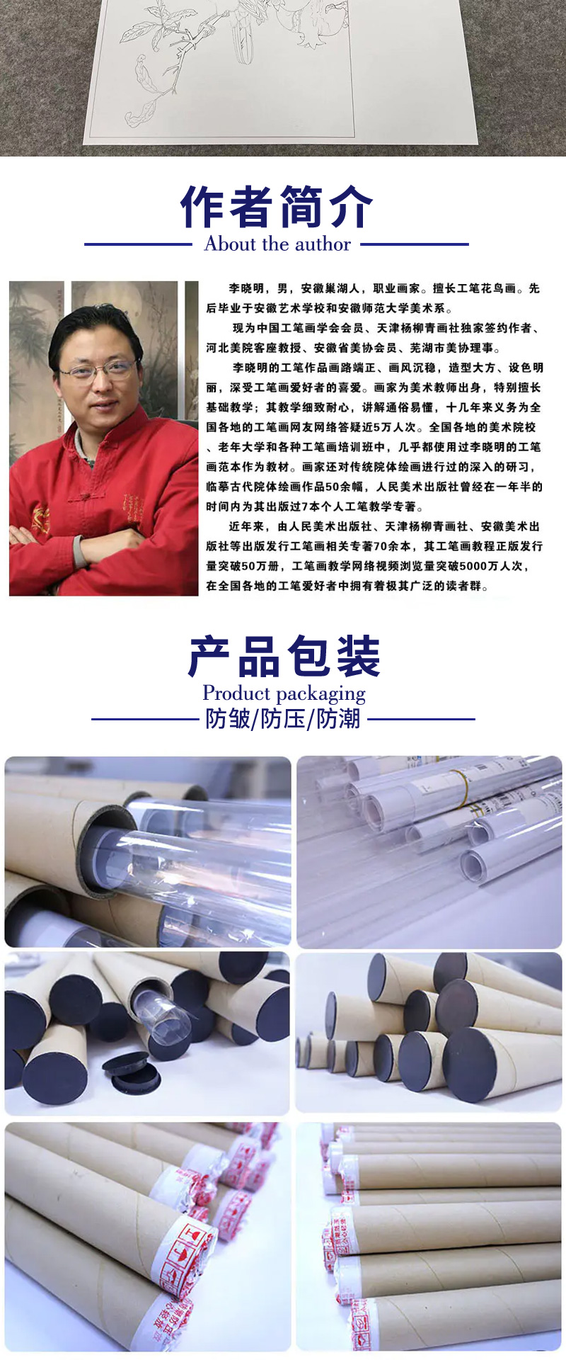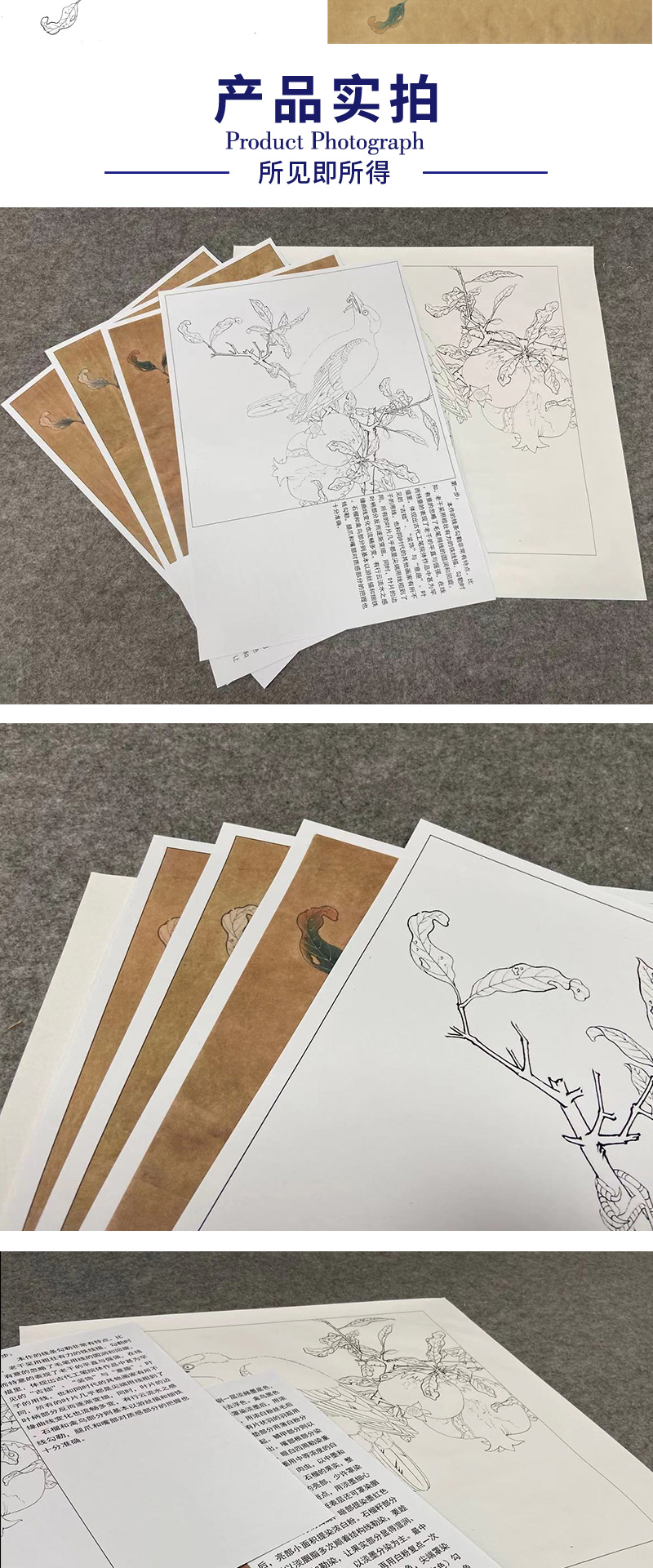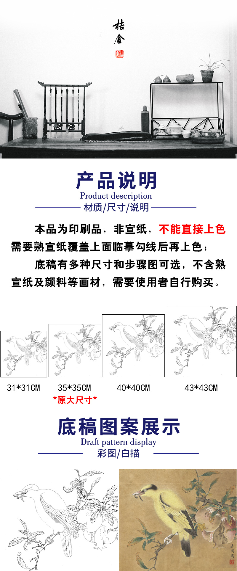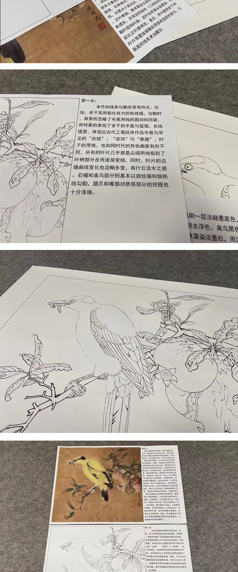 【有步骤、大彩图】李晓明工笔画白描底稿斗方小品《榴枝黄鸟图》石榴黄鹂初学者临摹花鸟线稿KC31