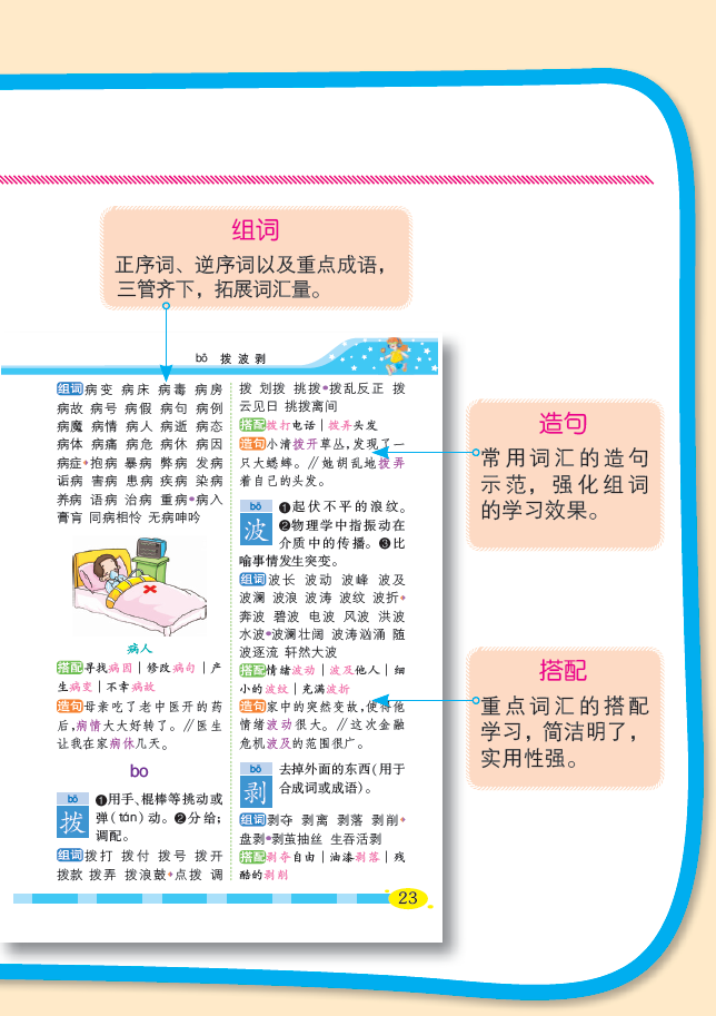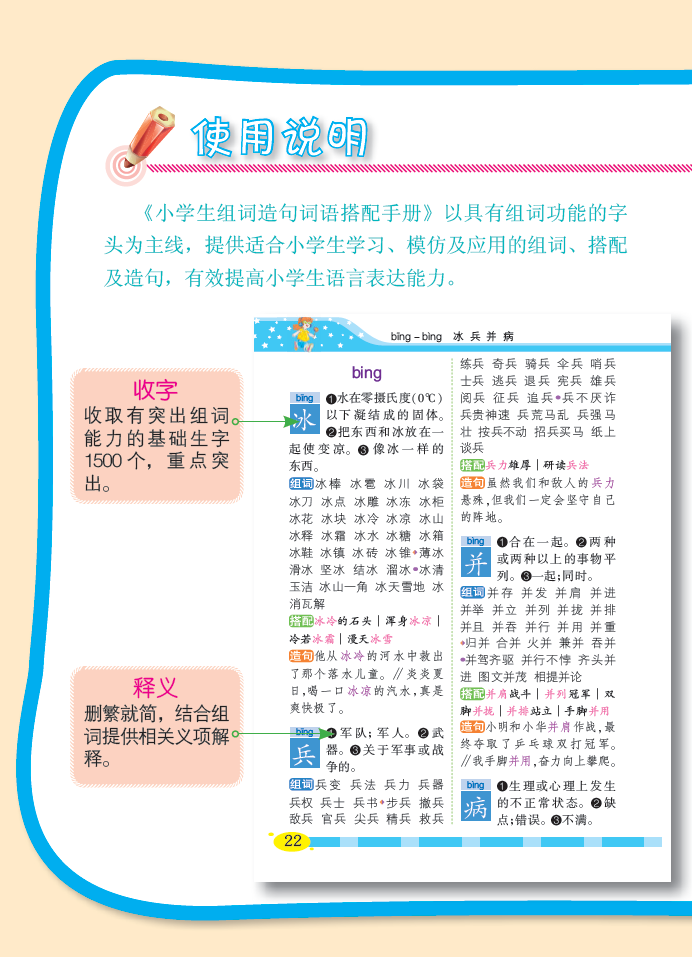 本手册根据小学语文新课标的要求,结合小学生的认知特点,从小学语文所要求掌握的汉字中挑选了组词功能突出、适用面广的基础汉字1500个,结合字的不同义项,提供适合小学生学习、应用的组词近30000条,包括了常用 正序词、逆序词以及部分重点成语等。还提供了重点词的搭配应用及造句示例,真正从字、词、义三方面提升了小学生学习字词的量与质。