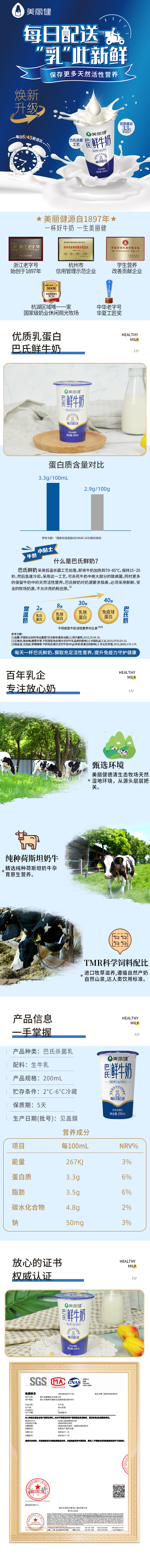 【限时9折】美丽健纸杯巴氏鲜牛奶200mL/30天