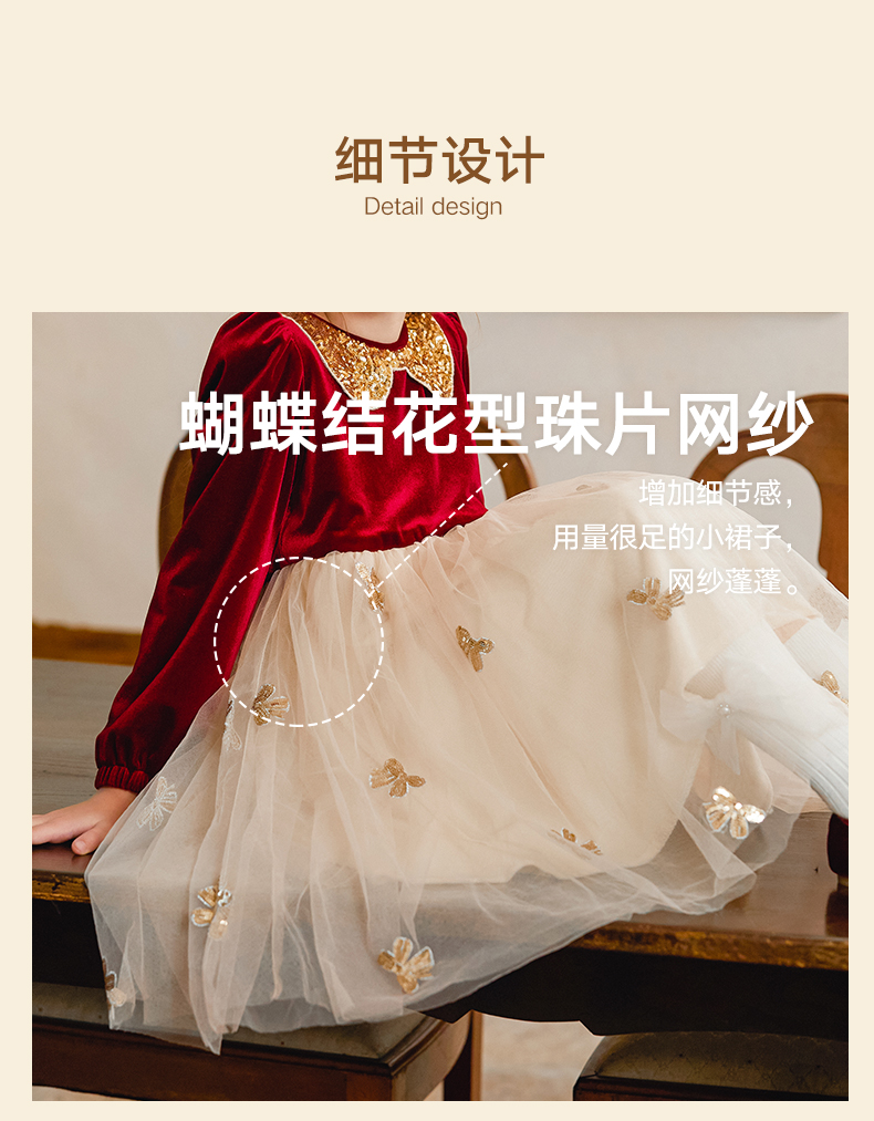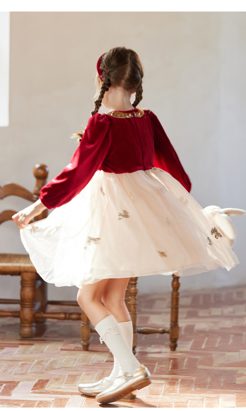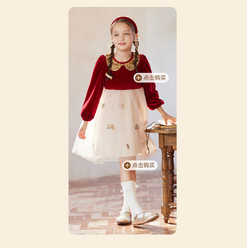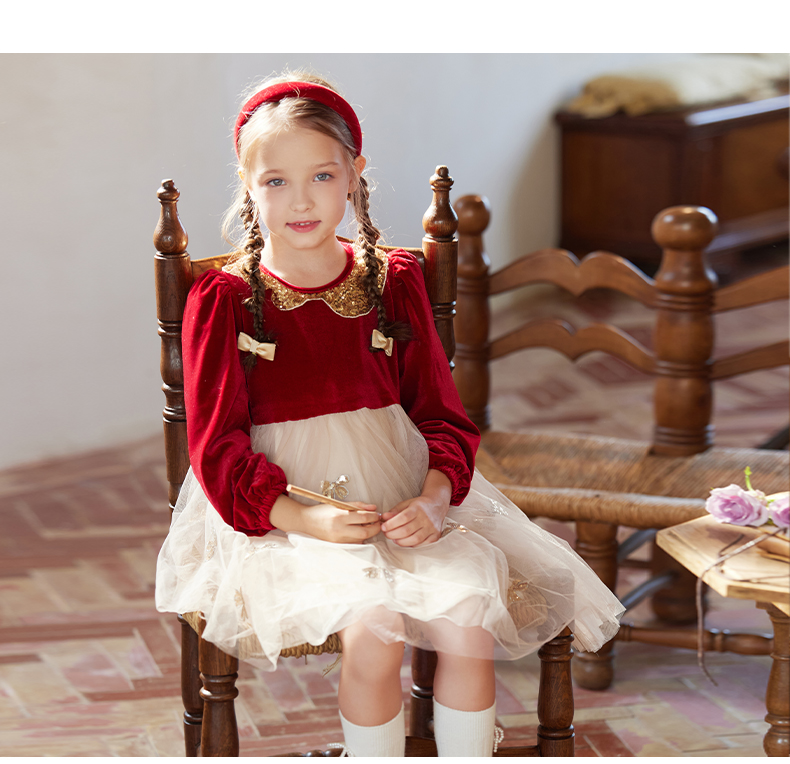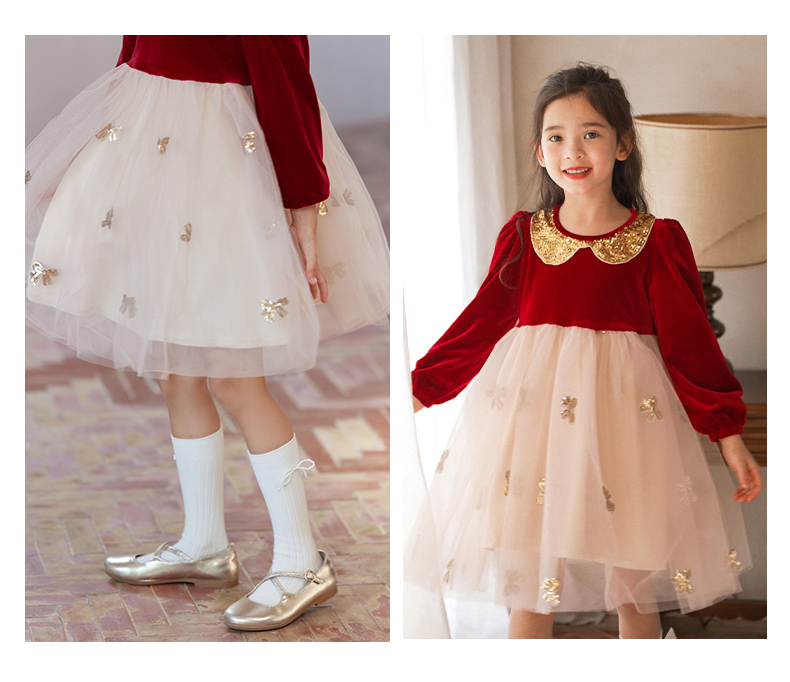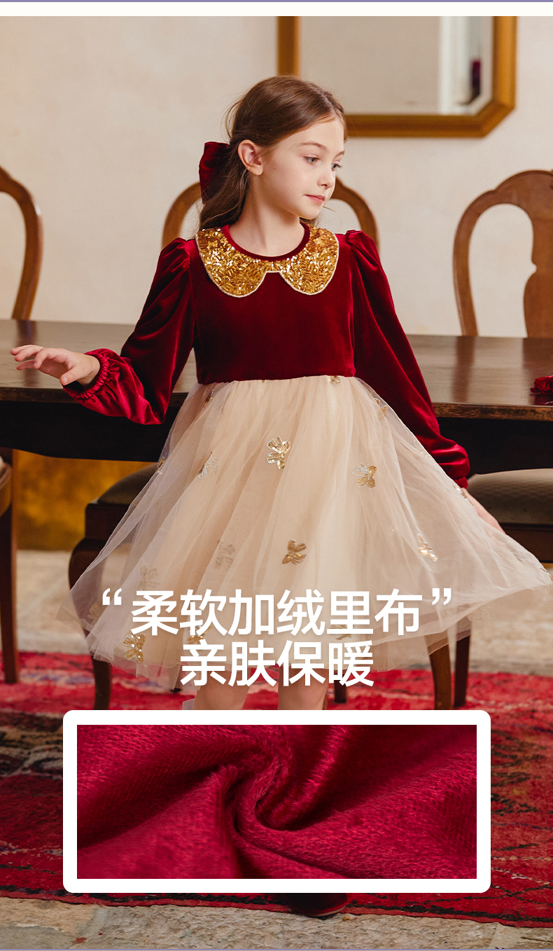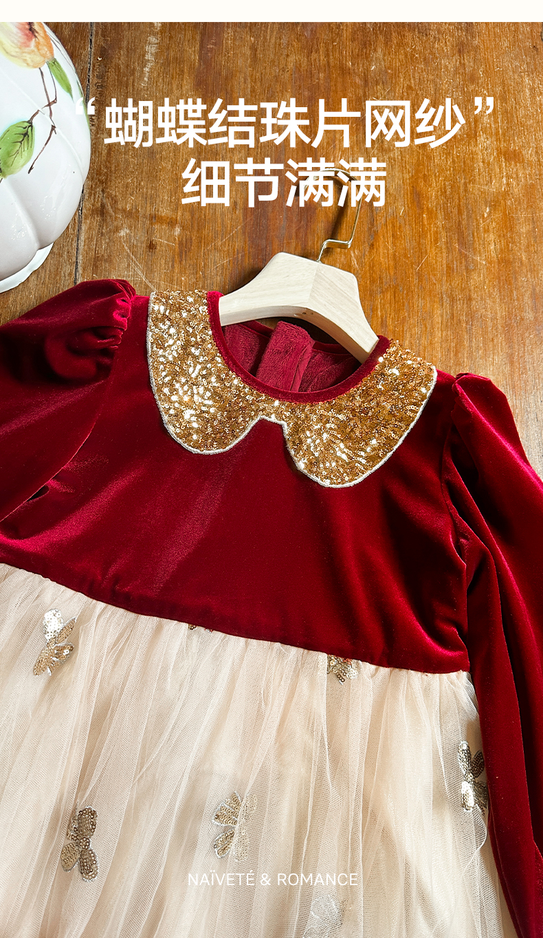 LittleNaive秋冬女童圣诞礼服红色新年网纱公主裙儿童加绒连衣裙