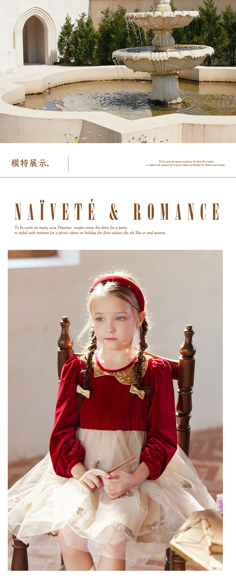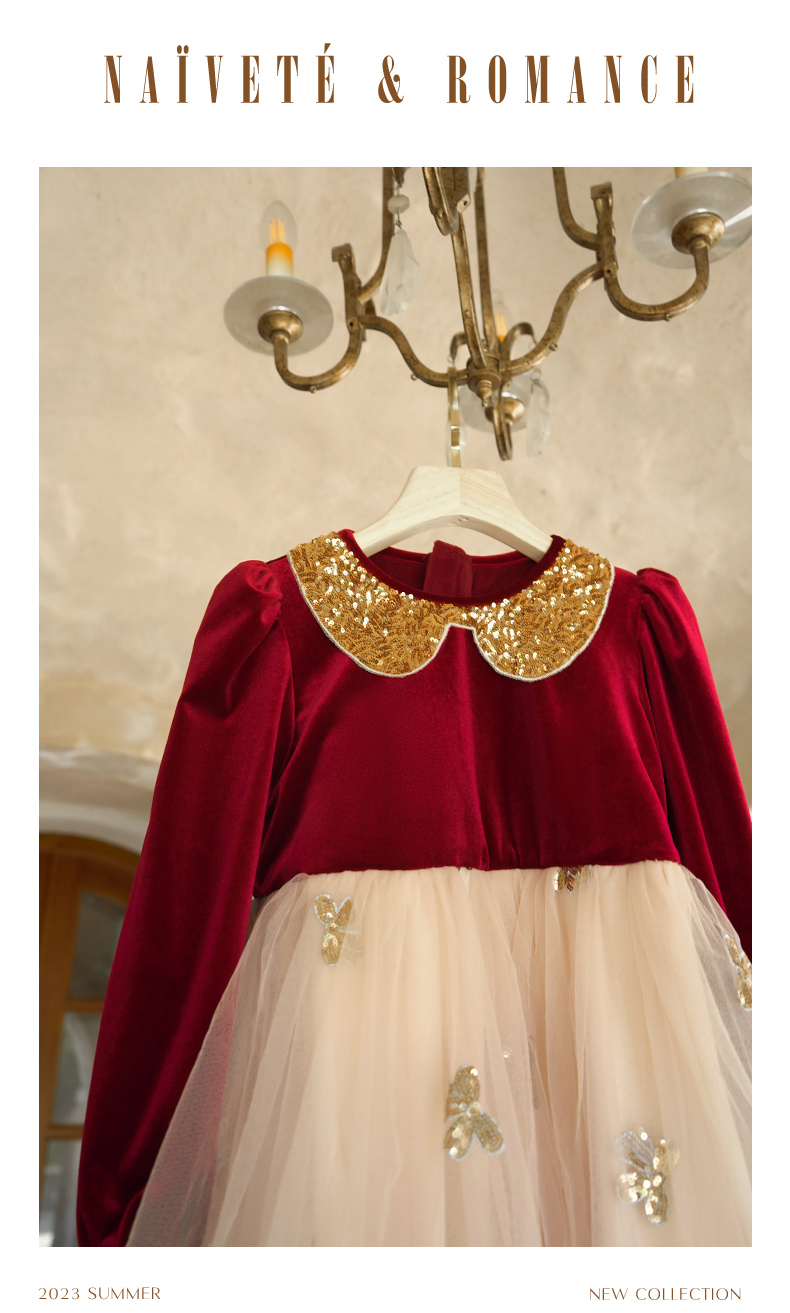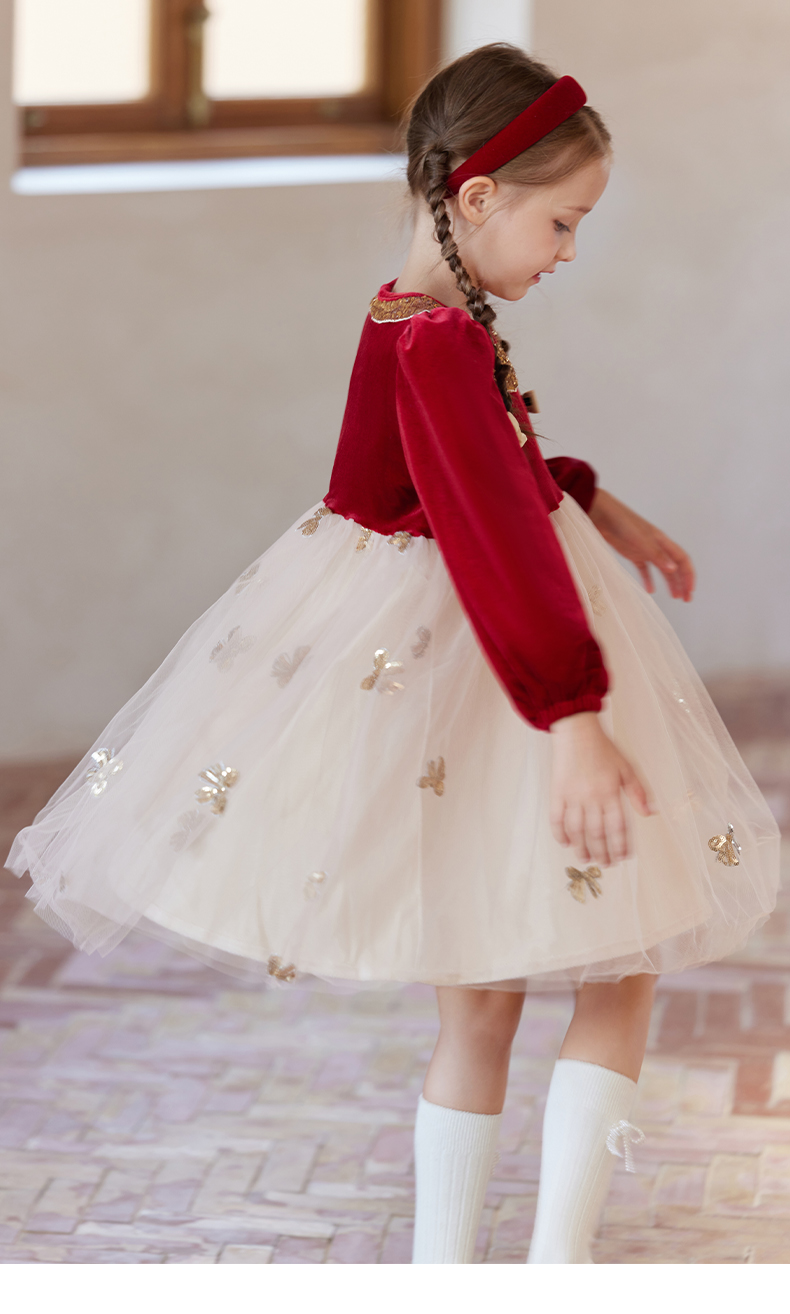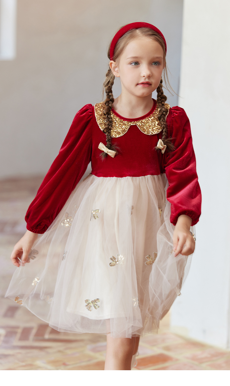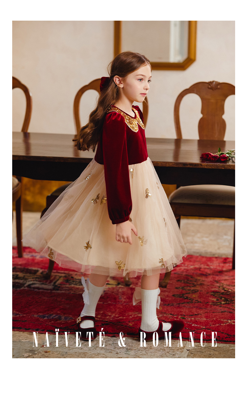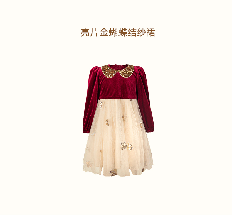 LittleNaive秋冬女童圣诞礼服红色新年网纱公主裙儿童加绒连衣裙