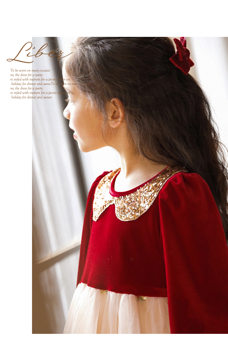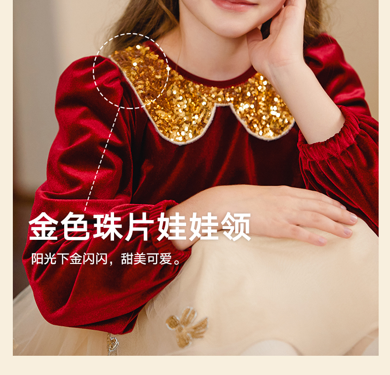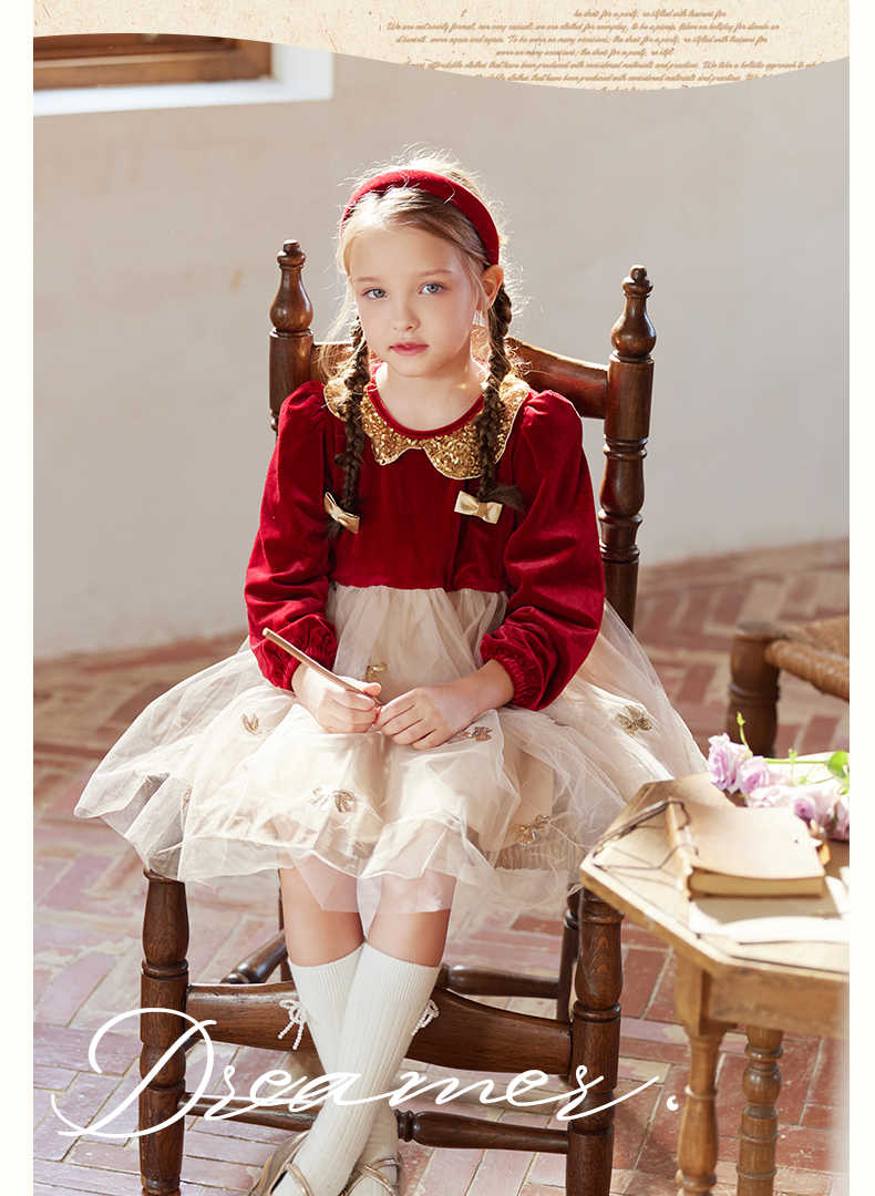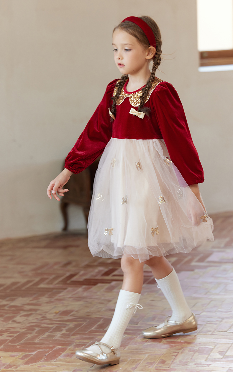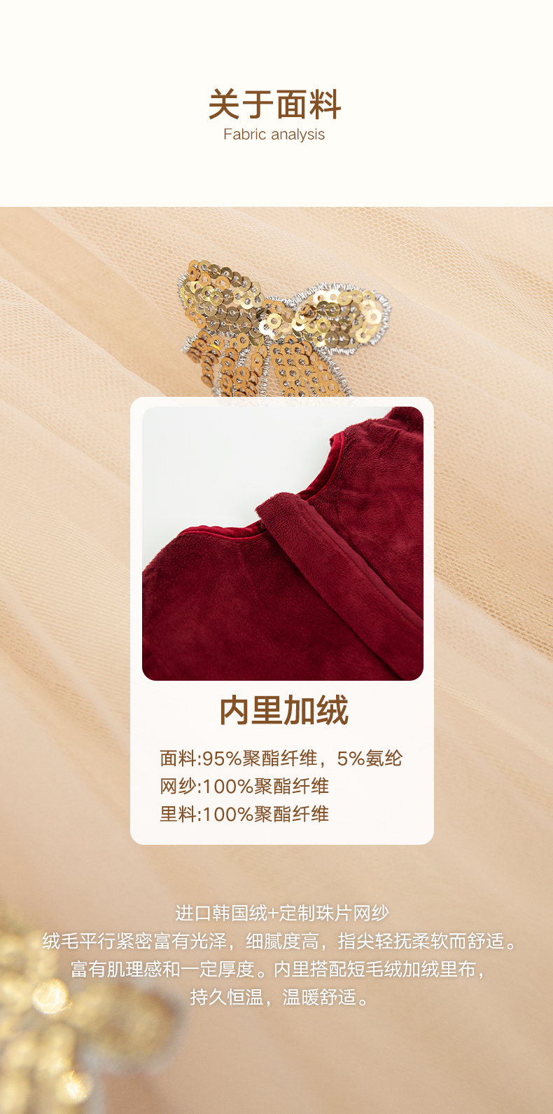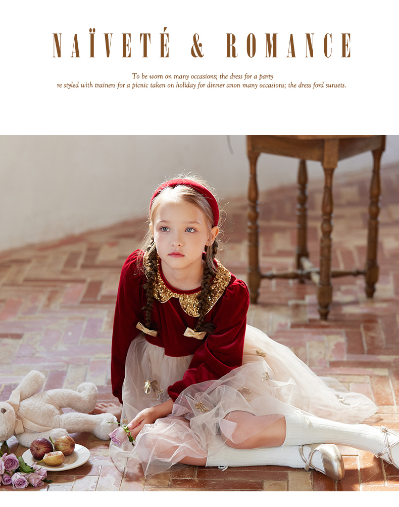 LittleNaive秋冬女童圣诞礼服红色新年网纱公主裙儿童加绒连衣裙