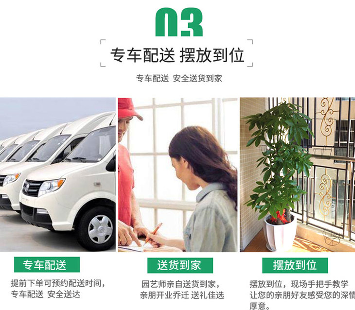 3、绿植是从绿植养护基地专人专车配送上门的,所以因地址不准确,收货地址临时改变,电话不通,收货人拒收等因素造成的无法配送和临时撤单,我们不承担相应的责任,无法退款,如需二次配送,需加收二次配送运费。