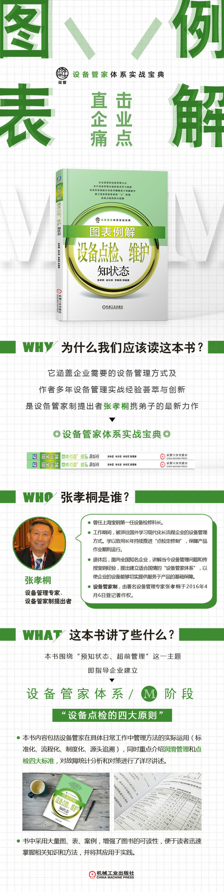 本书围绕设备管理的“预知状态、超前管理”,讲解设备管家体系中,点检、维护阶段应具备的知识、方法及案例。本书主要内容包括设备管家维护的内容和职责要求,设备管家的设备点检,企业设备点检的“四大标准”,设备管理故障统计、分析与对策。点检和维护是指导企业建立设备管家体系“HMRO”四个阶段中的“M”阶段,本书包括设备管家在具体日常工作中管理方法的实际运用(标准化、流程化、制度化、源头追溯),同时重点介绍润滑管理和点检四大标准,对故障统计分析和对策进行了详尽讲述。通过应用本书的内容,本书可以帮助企业建立起三位一体的设备管家设备维护体系,使管家制的各方成员知道如何发挥自己的作用,实现由被动管理到主动管理的转变。