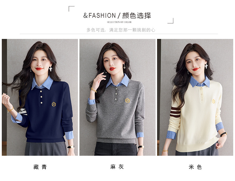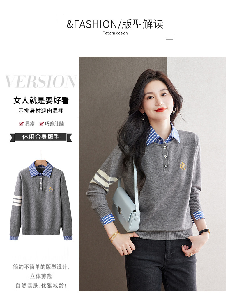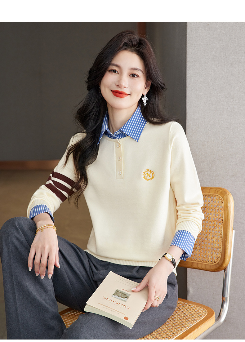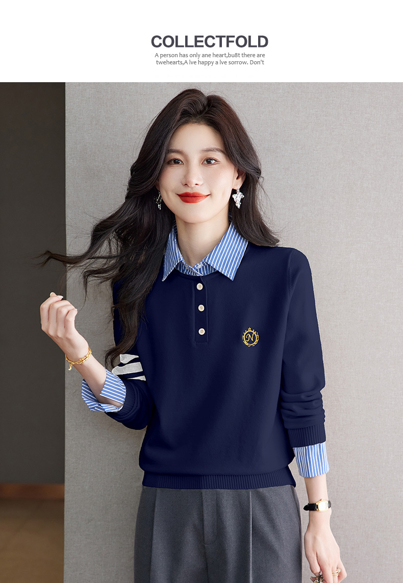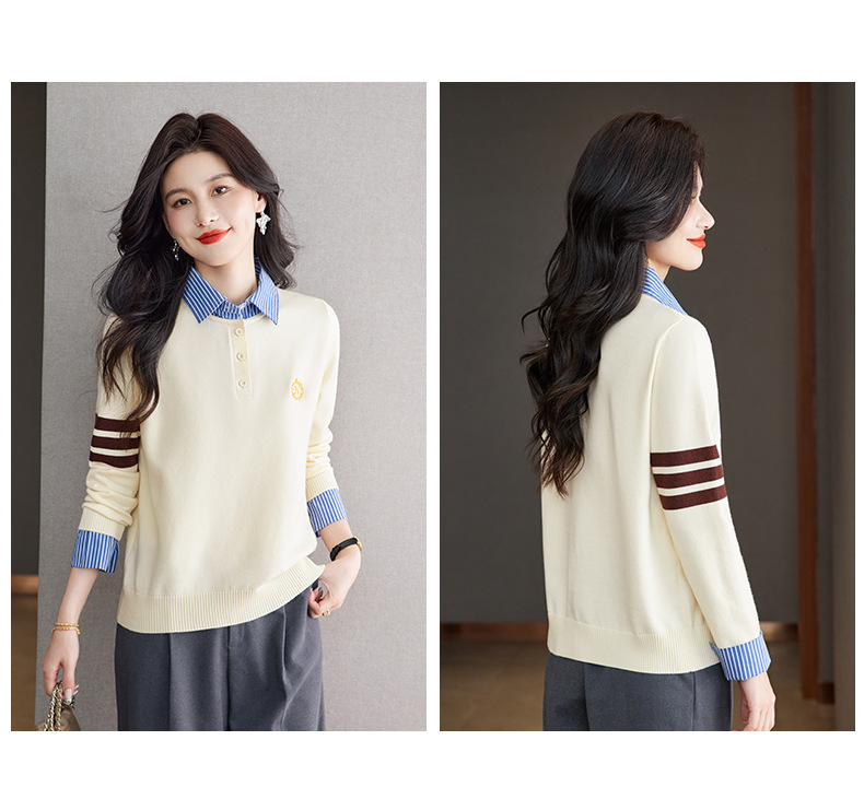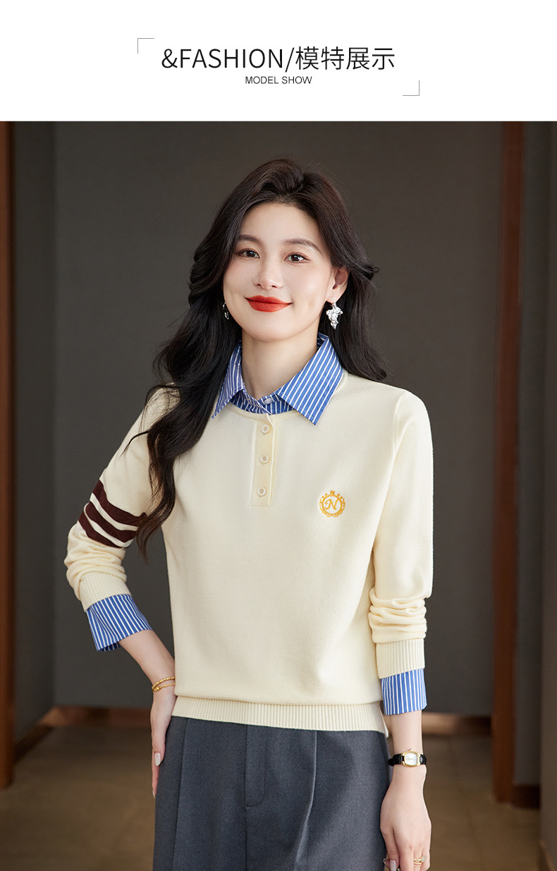 CC针织假两件上衣女2025春秋新款衬衫领毛衣拼接条纹时尚长袖打底衫