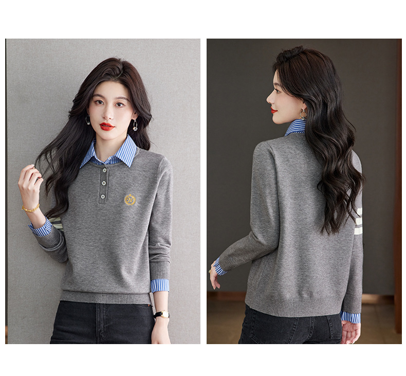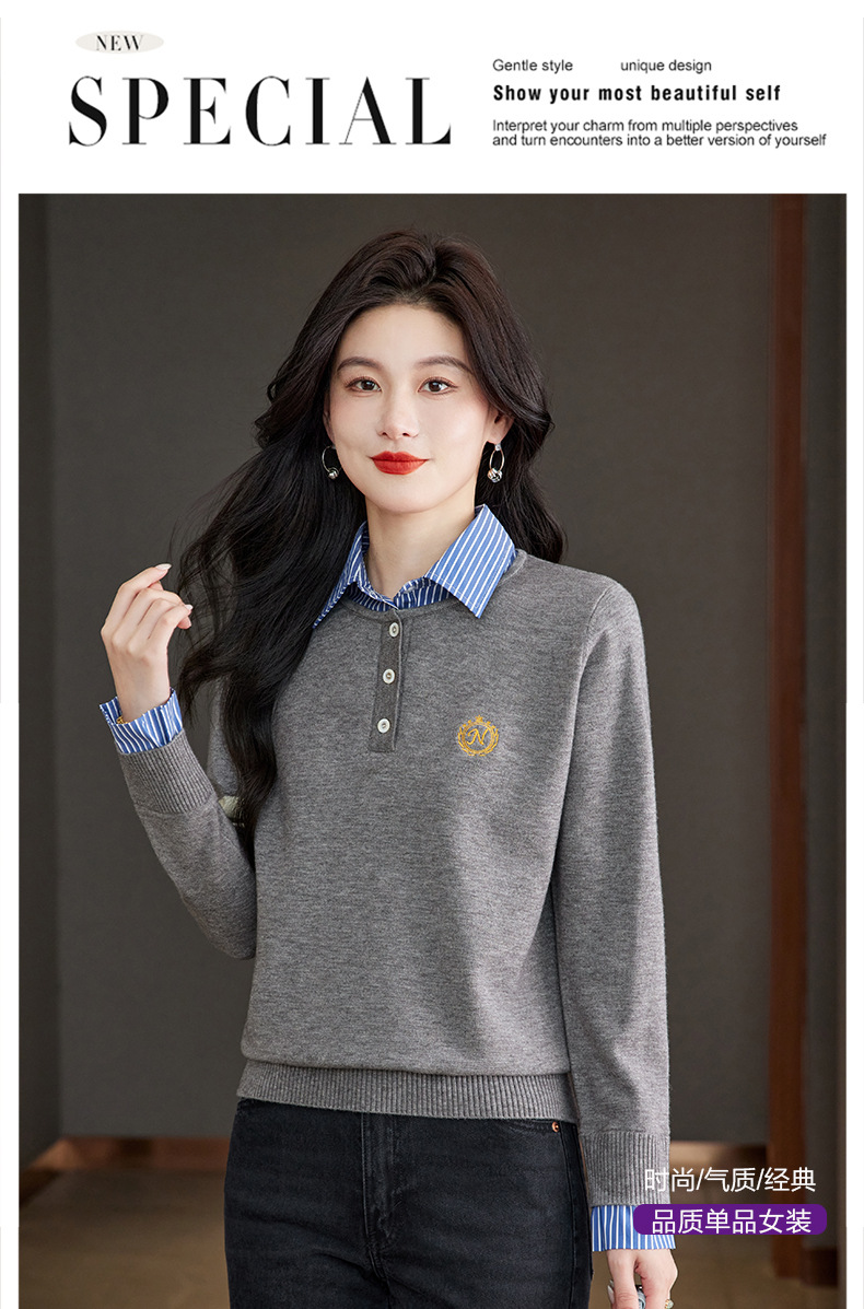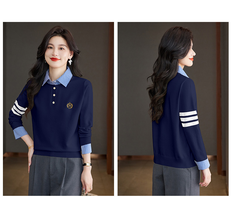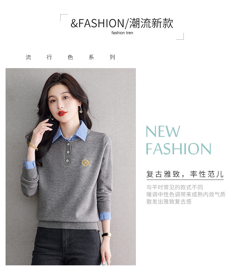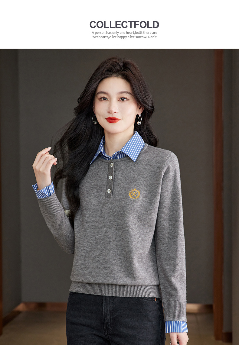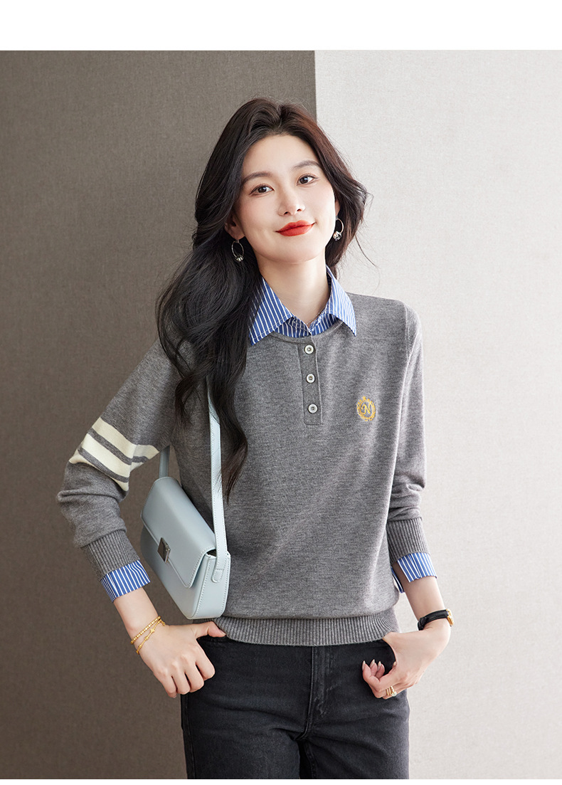 CC针织假两件上衣女2025春秋新款衬衫领毛衣拼接条纹时尚长袖打底衫