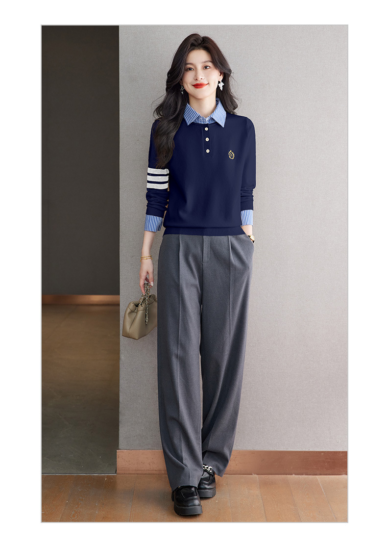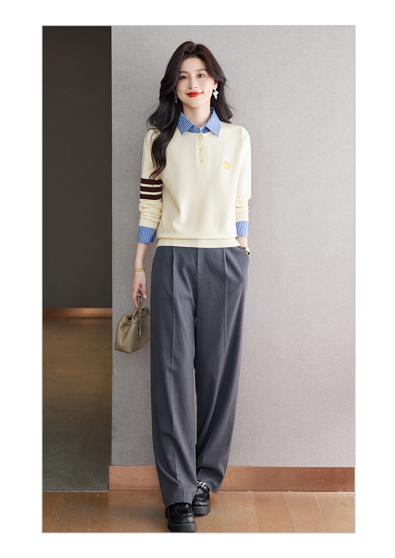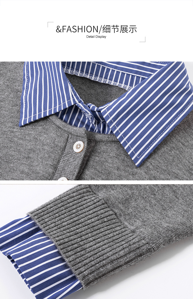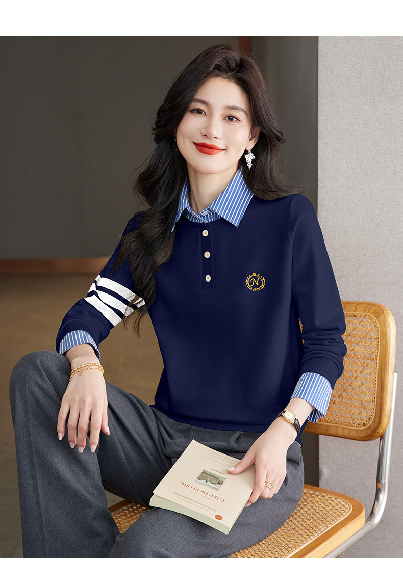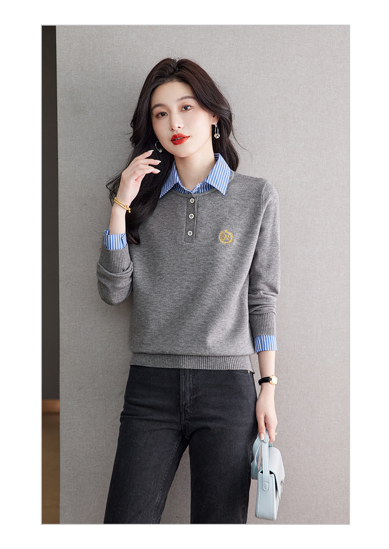 CC针织假两件上衣女2025春秋新款衬衫领毛衣拼接条纹时尚长袖打底衫