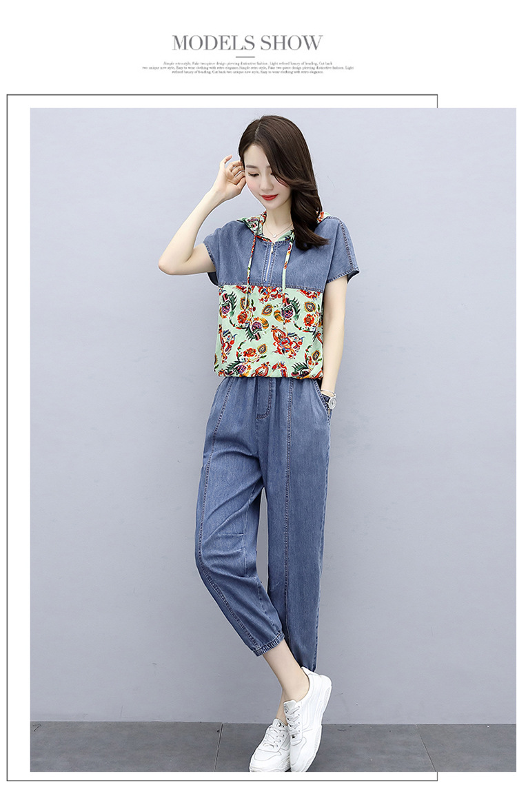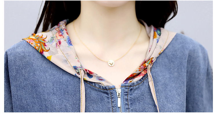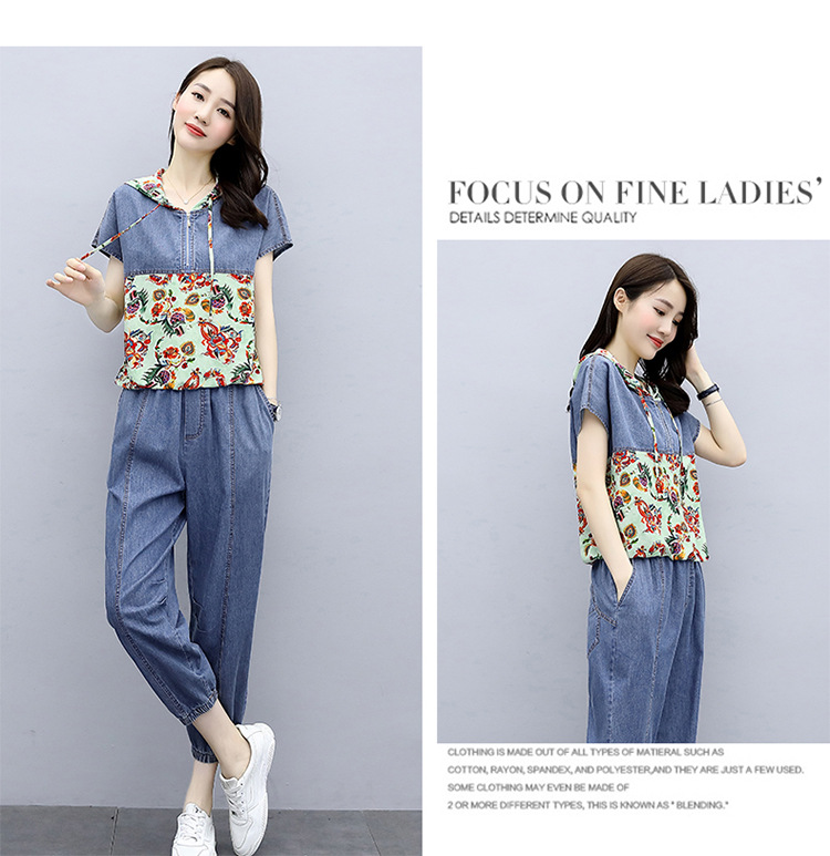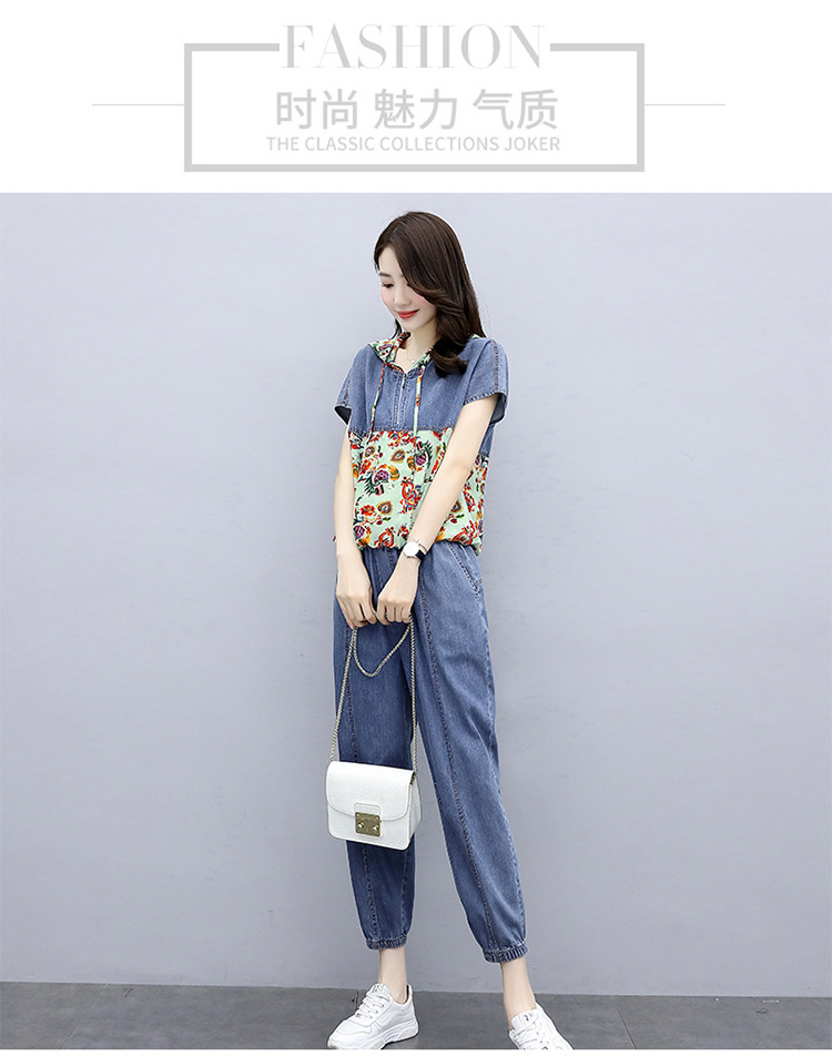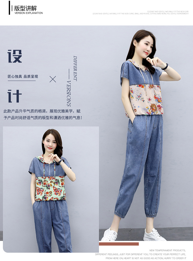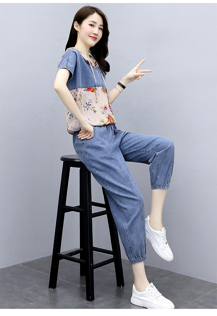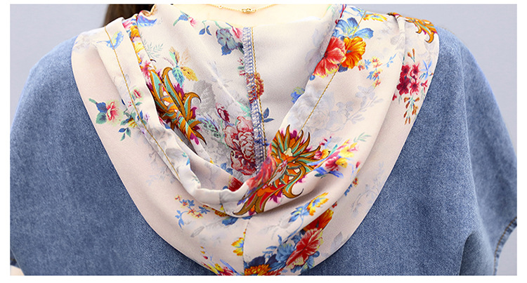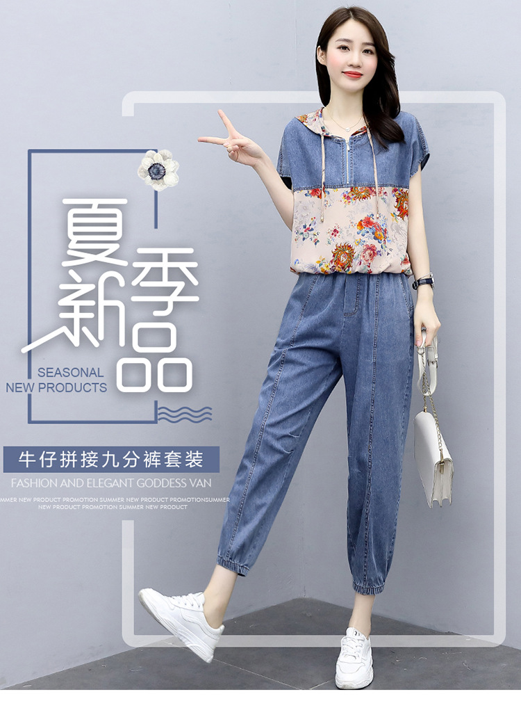 WZNH-GJC2090轻薄新款时尚休闲真丝印花雪纺拼接牛仔套装