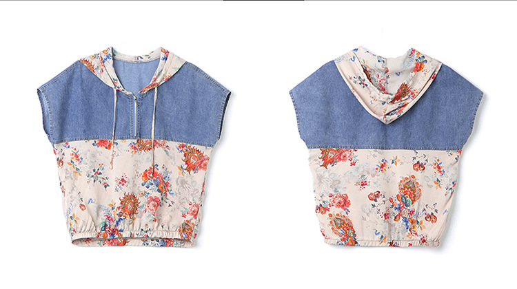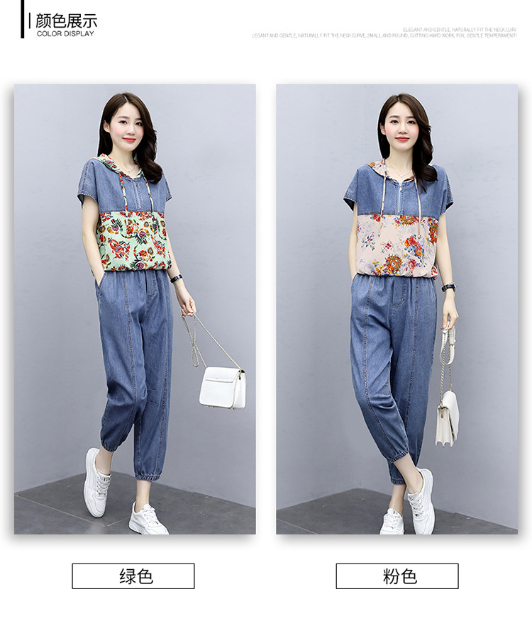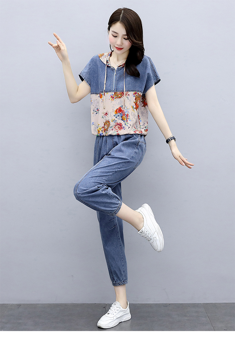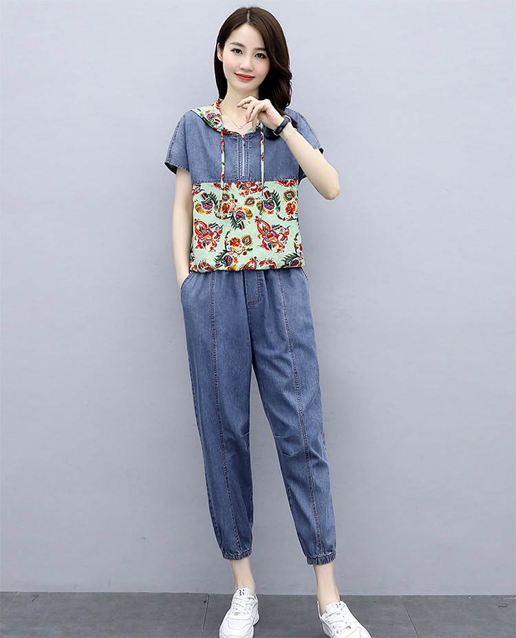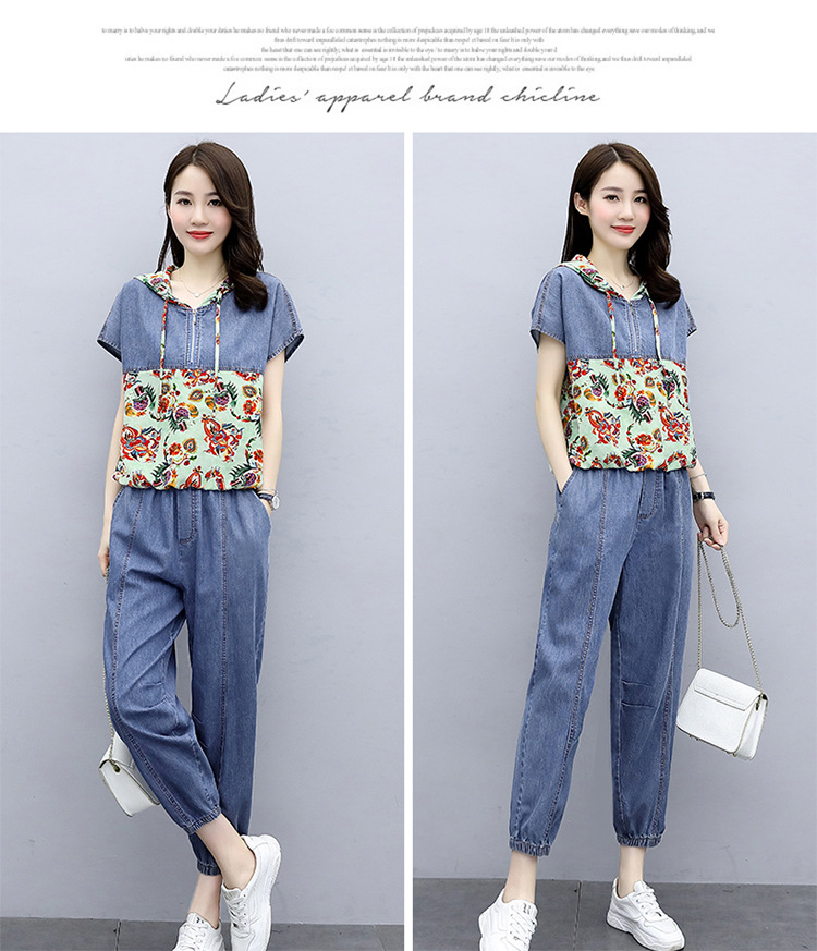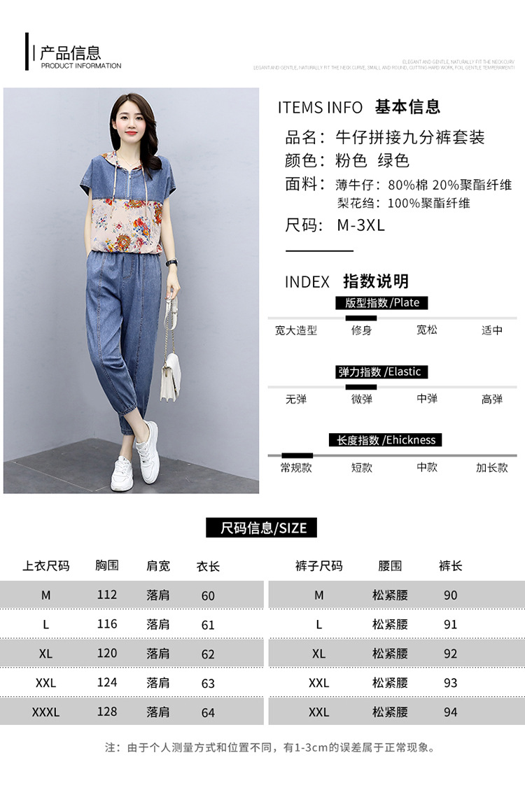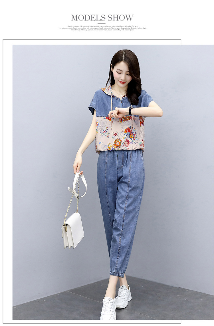 WZNH-GJC2090轻薄新款时尚休闲真丝印花雪纺拼接牛仔套装