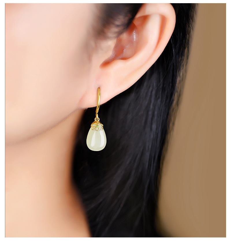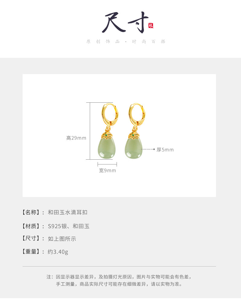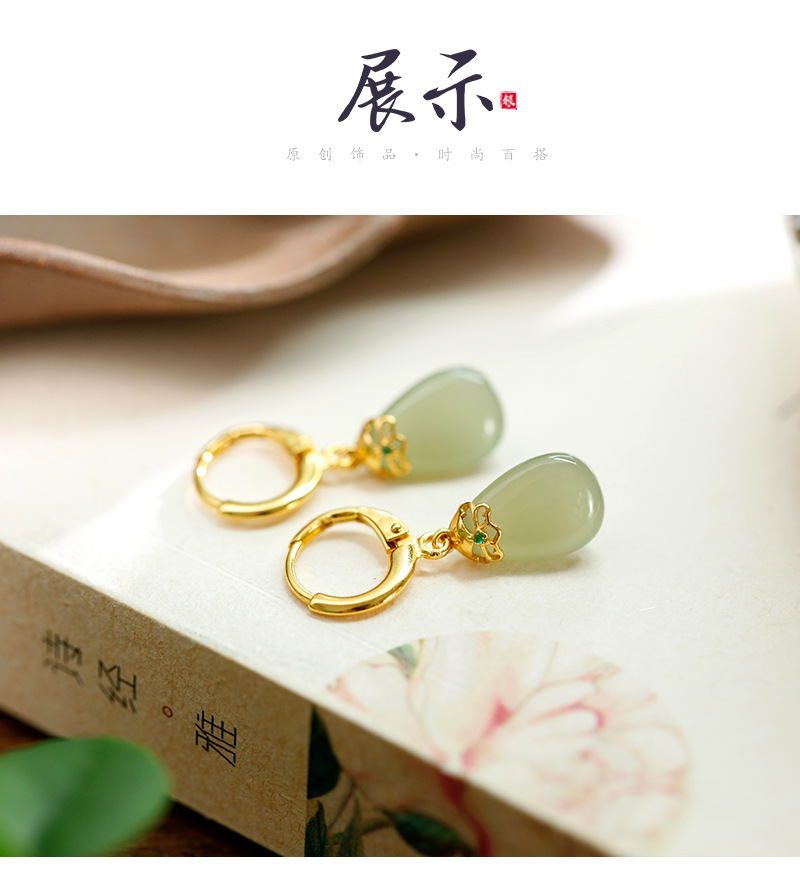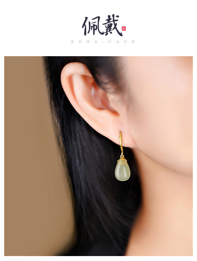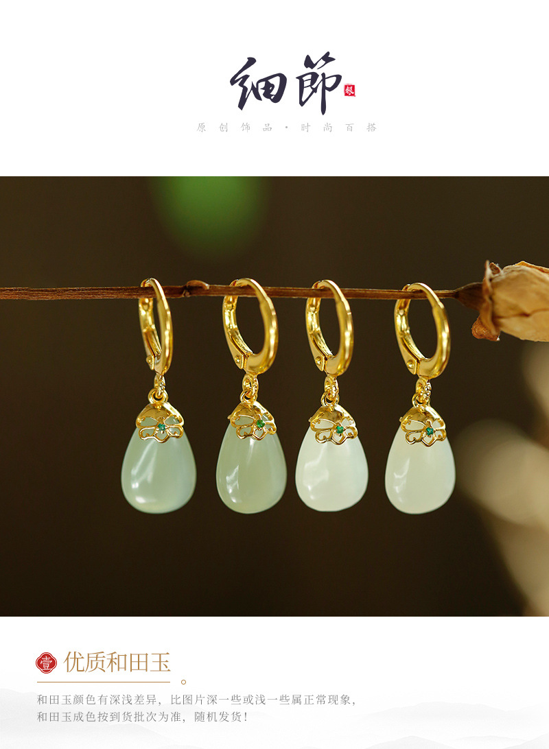 丁摩 天然和田青玉耳环耳扣女足银玉石耳坠复古精致水滴耳饰5ZF-55133