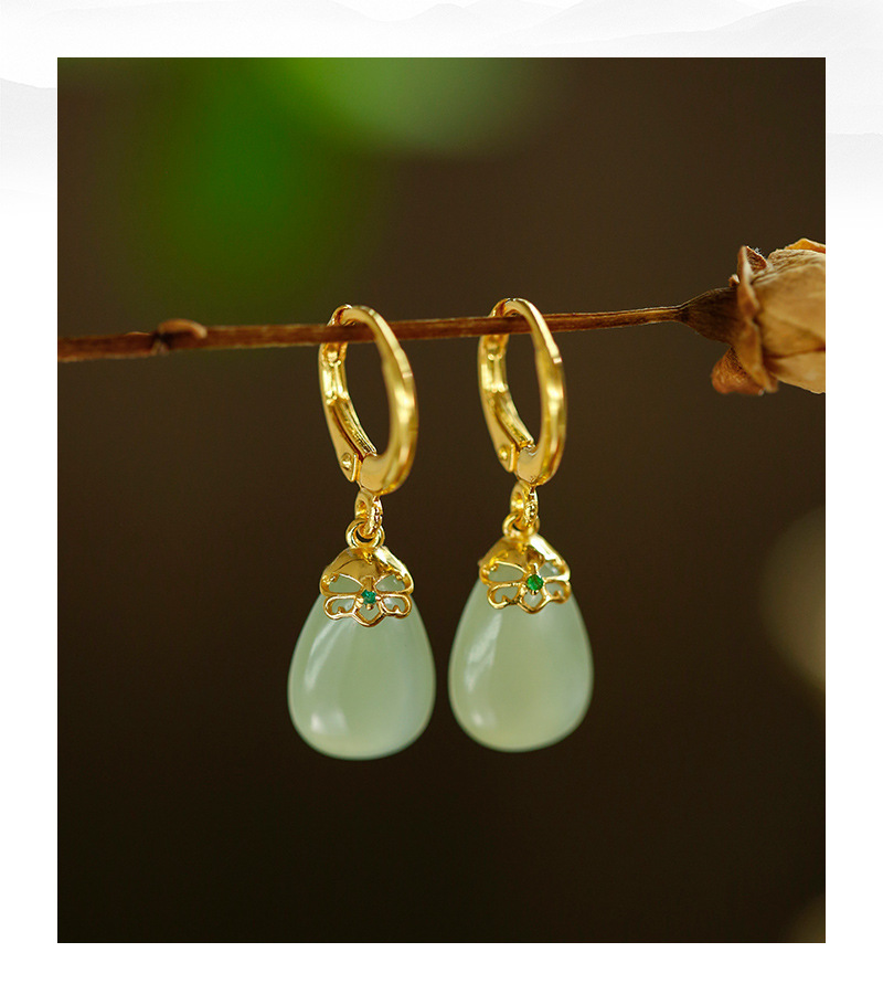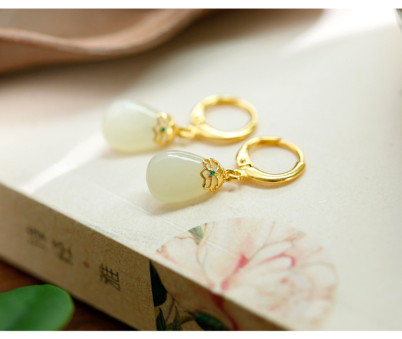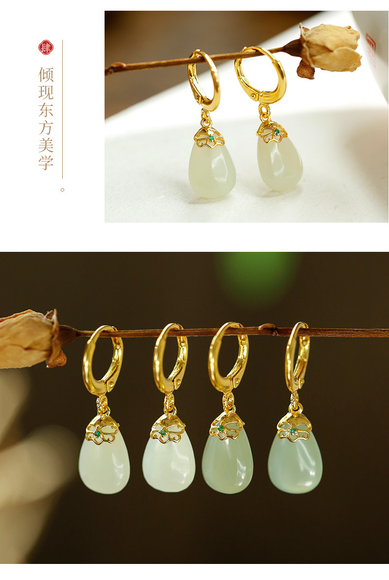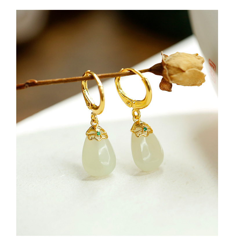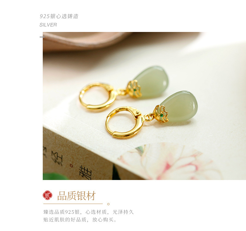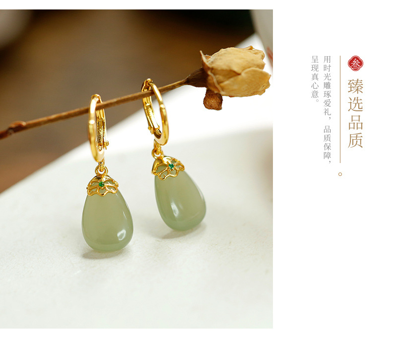 丁摩 天然和田青玉耳环耳扣女足银玉石耳坠复古精致水滴耳饰5ZF-55133