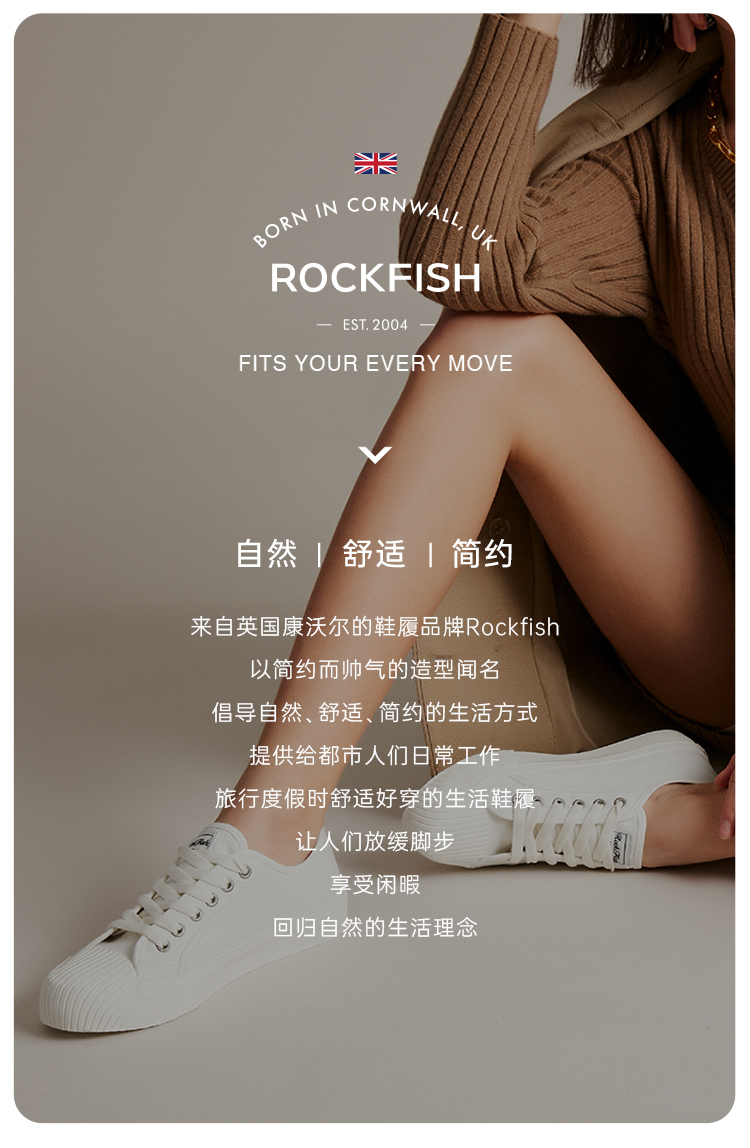 Rockfish-都市里的慢生活,来自一个在英国⻄西南部的⼩镇,Cornwall。他们有⾃己的语⾔风俗。在那里,人们回归自然, 享受闲暇、舒适、简约、质朴、宁静的生活。 Cornwall Collection休闲鞋系列。