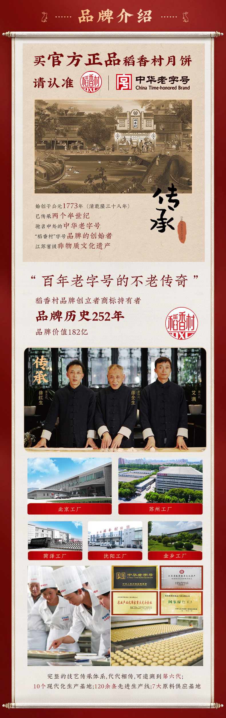稻香村始创于公元1773年(清乾隆三十八年),中国糕点行业现存历史悠久的企业之一,历经两个多世纪的发展,稻香村以其悠久的文化底蕴、精湛的制作技艺、卓越的品质信誉和行业影响力,被誉为“糕点泰斗”。
