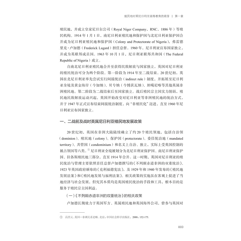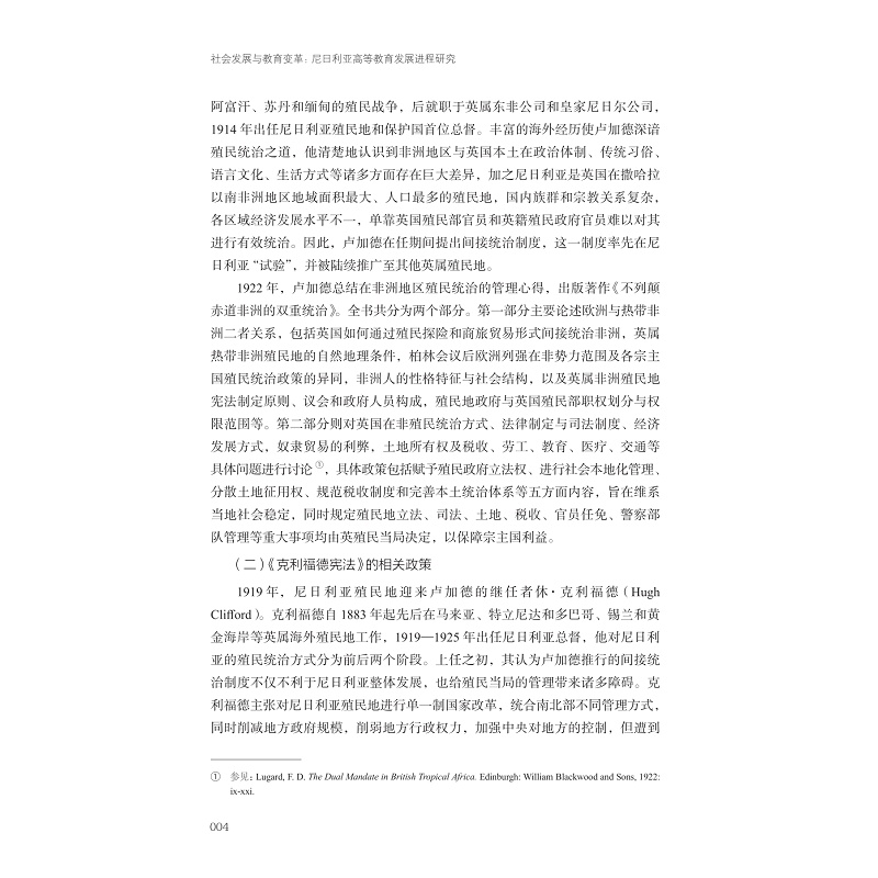 尼日利亚是非洲人口最多、经济体量最大的国家。近代以来,尤其是国家独立后,尼日利亚从传统社会向现代国家迈进,社会发展主要面临政治、经济、文化等三大历史任务与发展主题。这三方面发展任务的推进与实现都离不开教育,尤其是高等教育的支撑与支持。本书主要以历史脉络为主线,以上述三大主题为研究思路,对近代以来尼日利亚现代高等教育的发展与演变进行系统梳理,探究不同时期尼日利亚高等教育发展演变对国家政治局势稳定、社会经济进步、文化观念塑造的作用与影响,进而分析高等教育在尼日利亚现代国家建设中扮演何种角色,以期揭示百年来尼日利亚高等教育与社会变迁之间的相互关系。