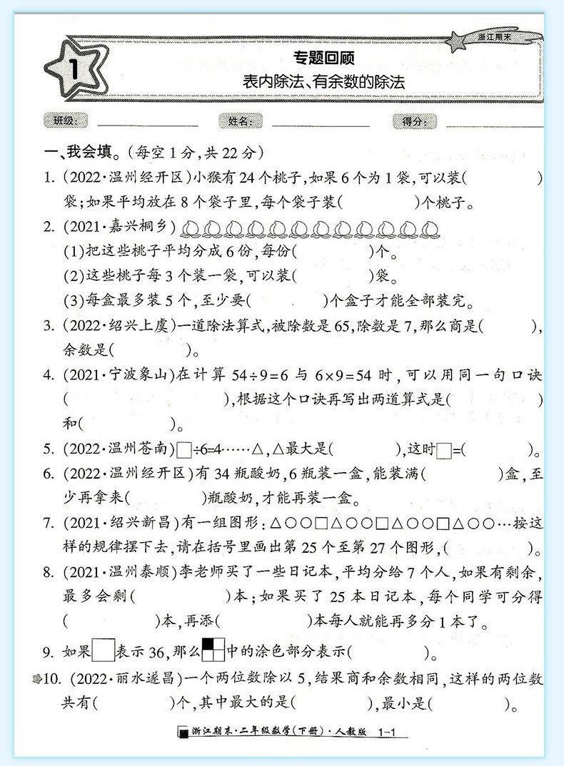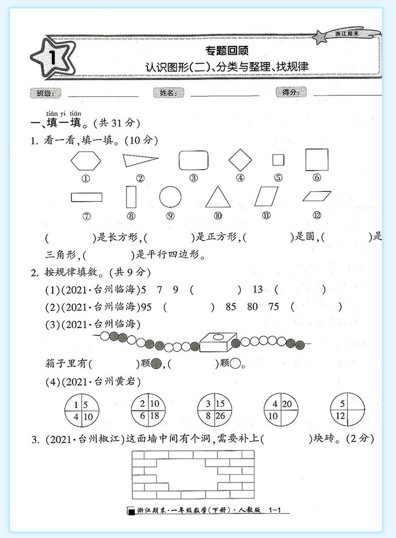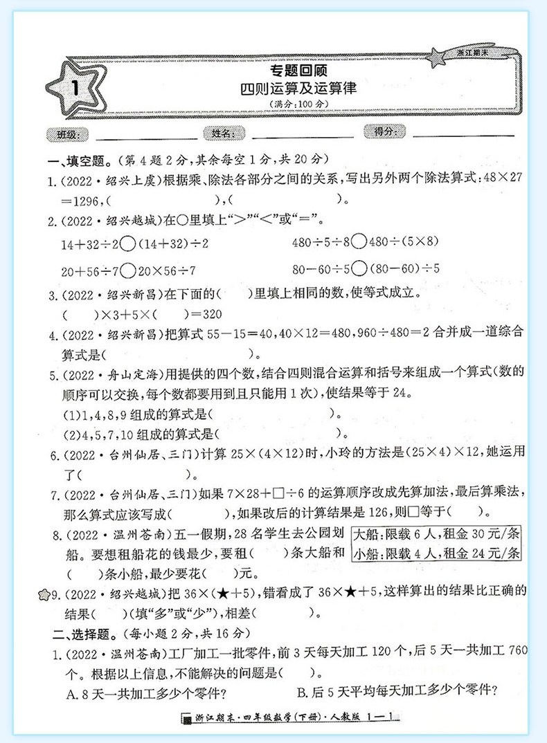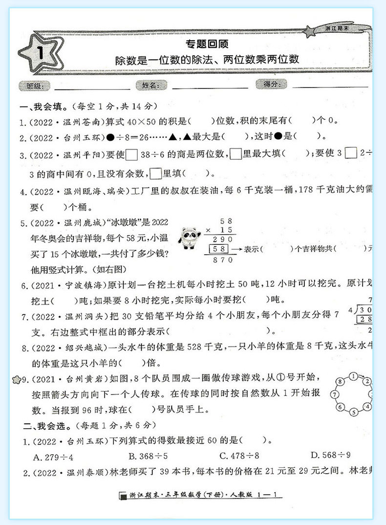 2025秋浙江期末上册人教励耘书业小学试卷测试卷全套复习期末总复习