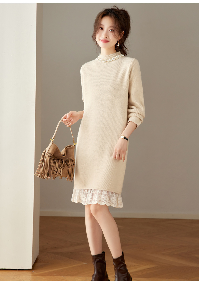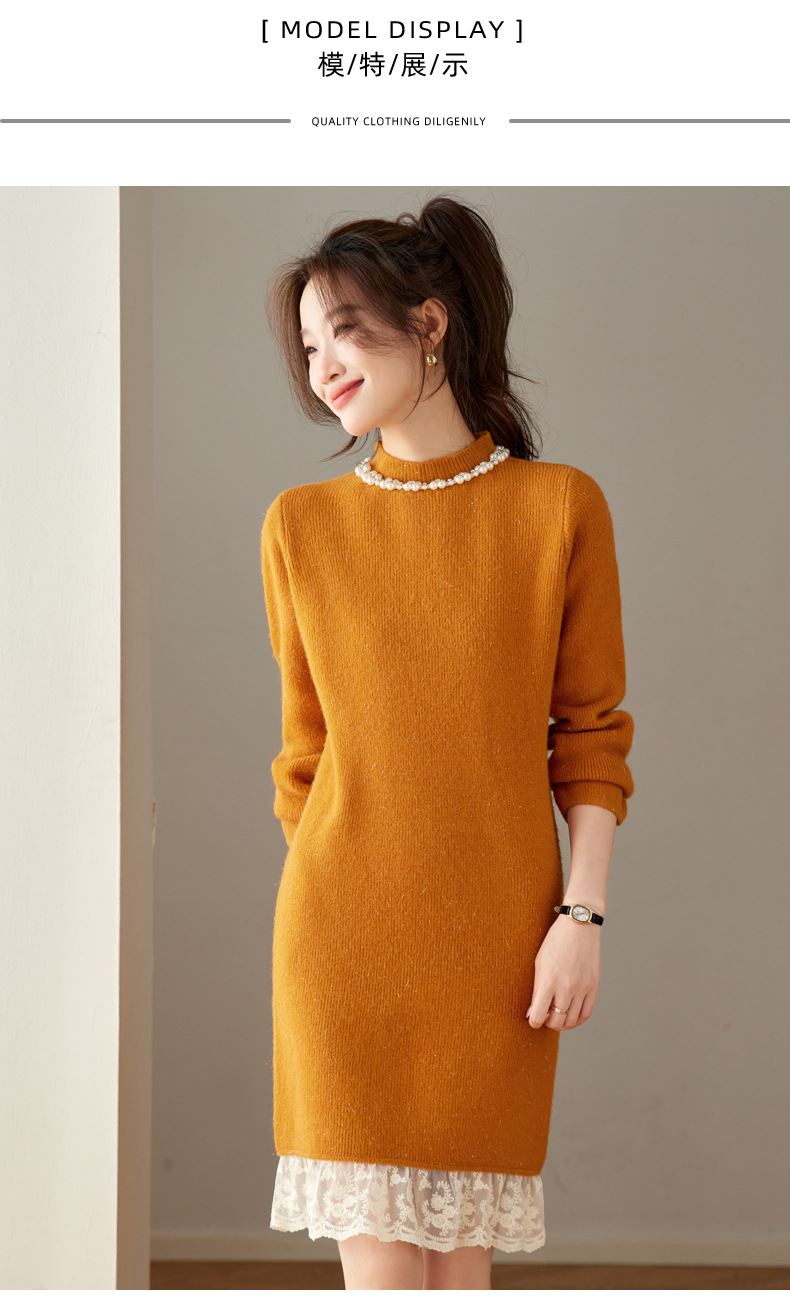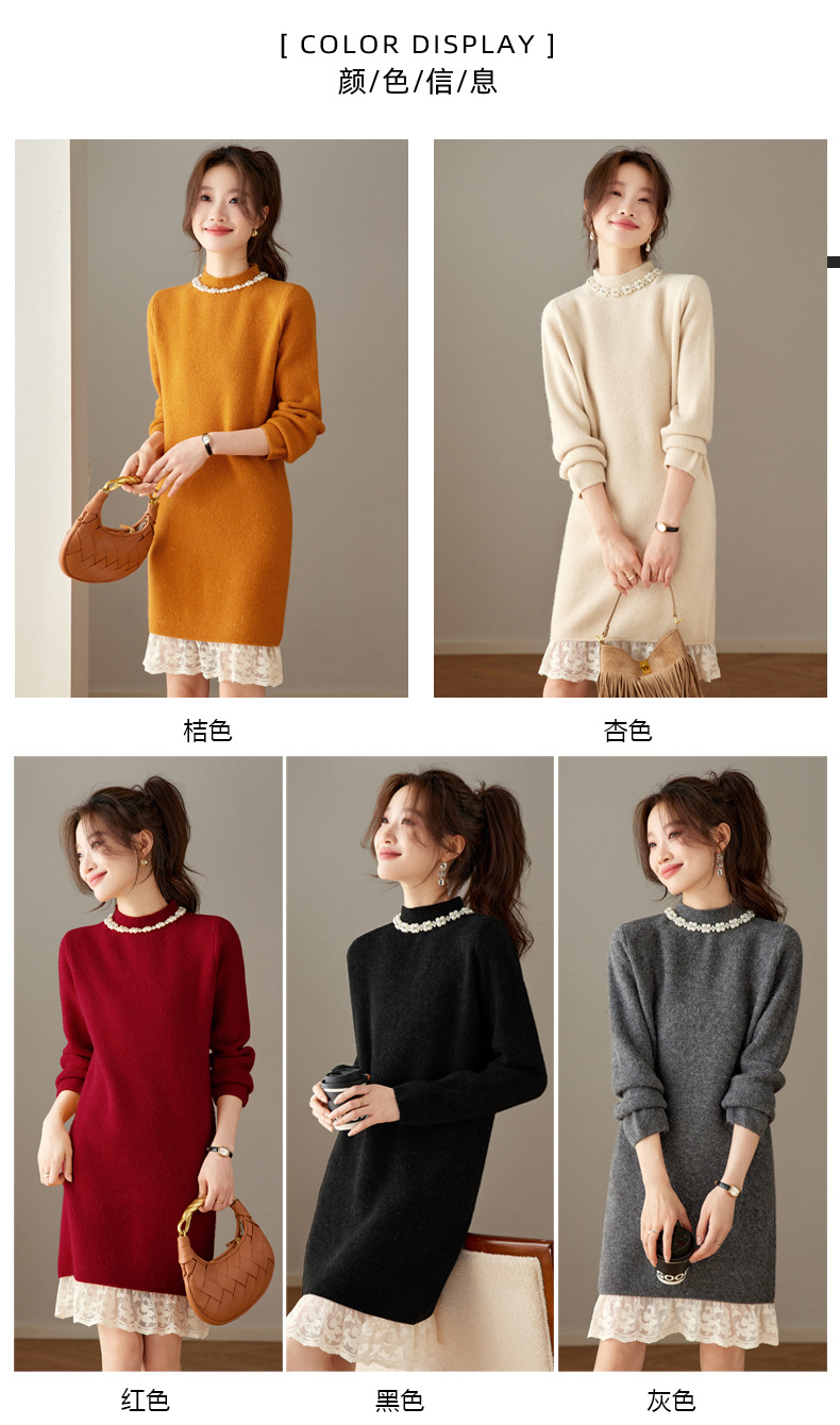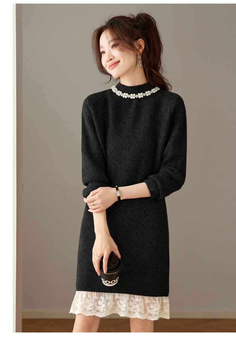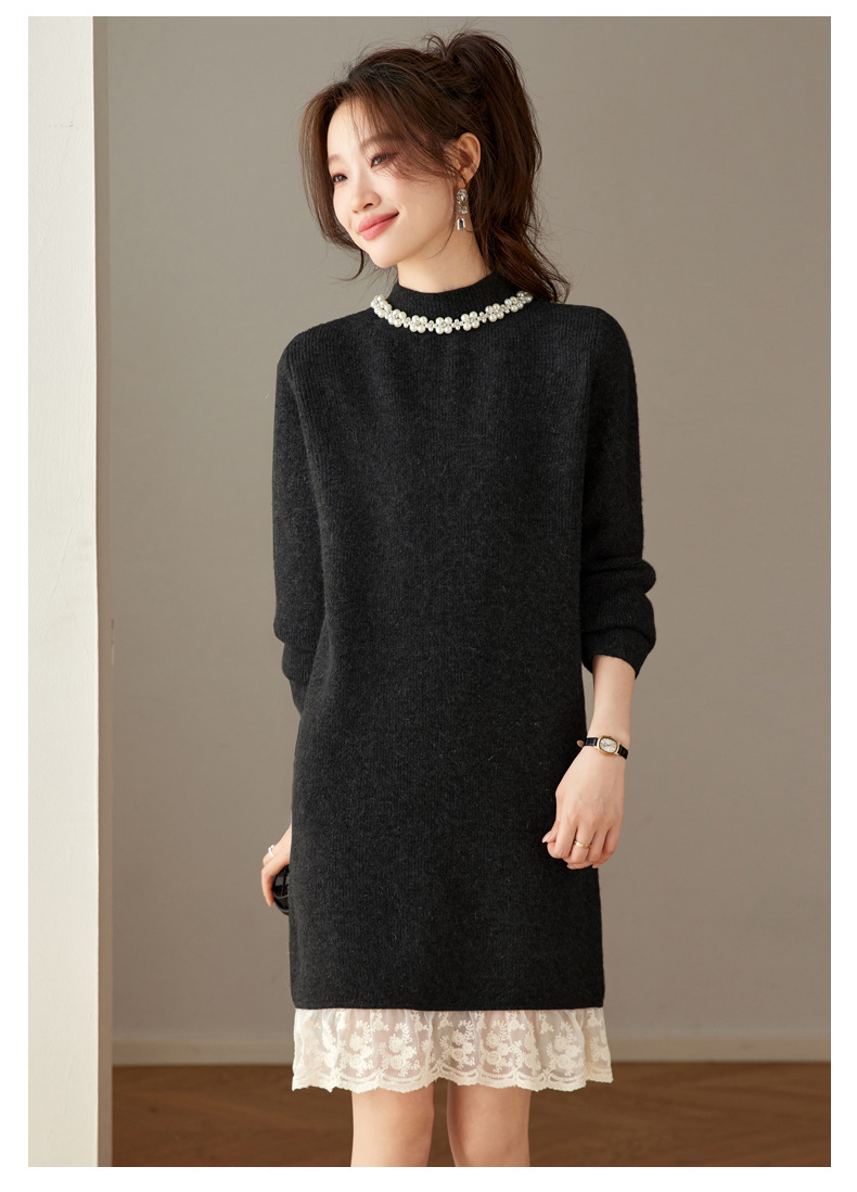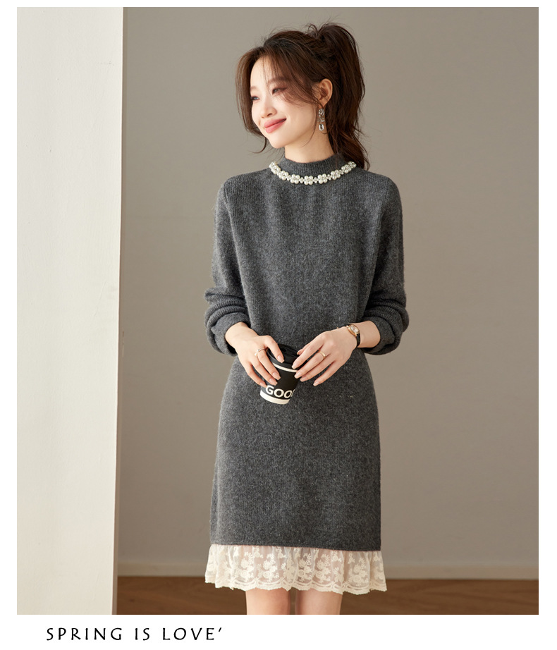 QL-8938蕾丝拼接针织打底连衣裙女秋冬中长款钉珠加厚配大衣内搭毛衣裙子