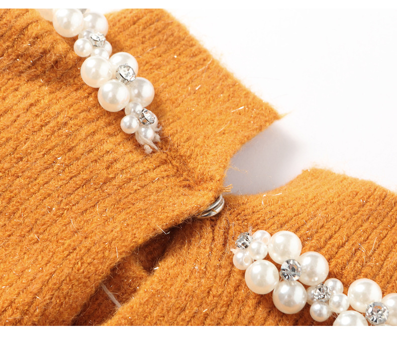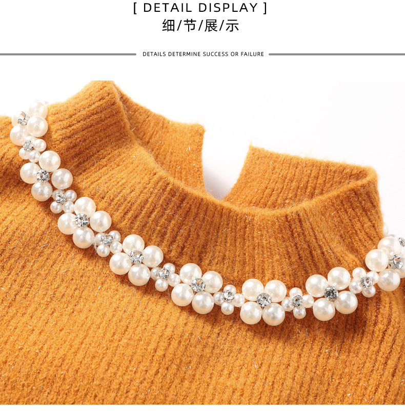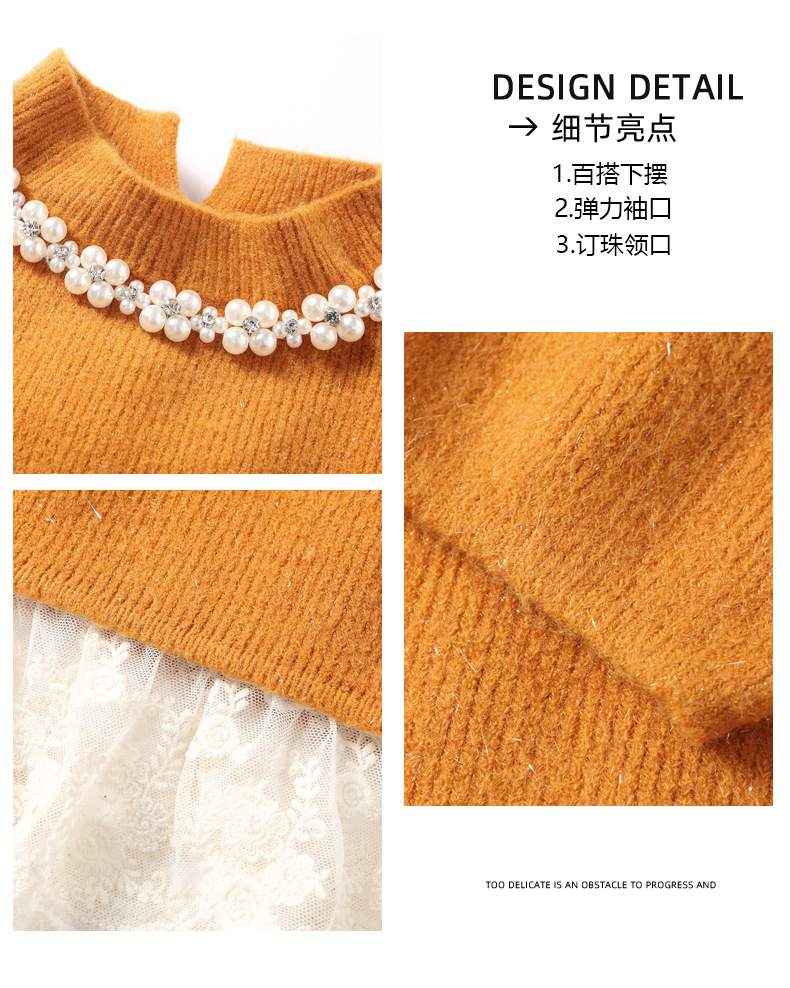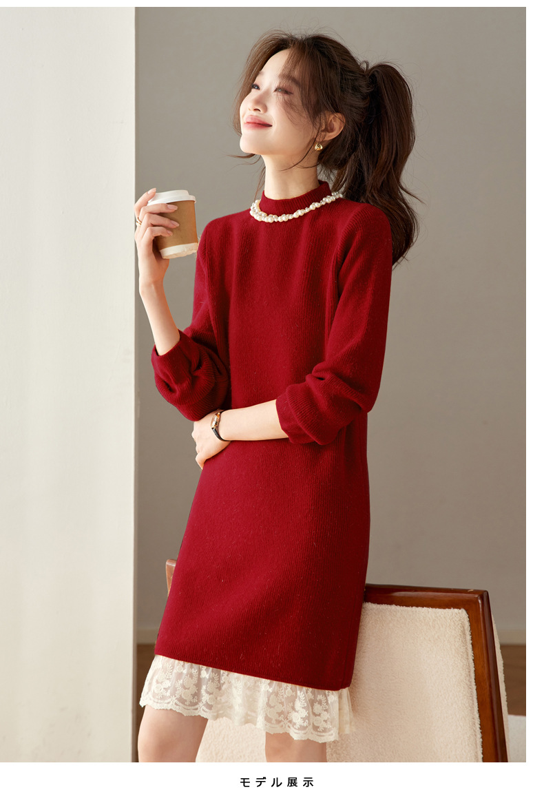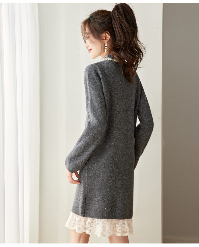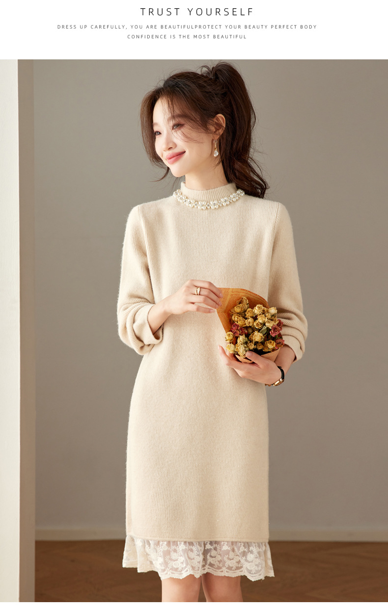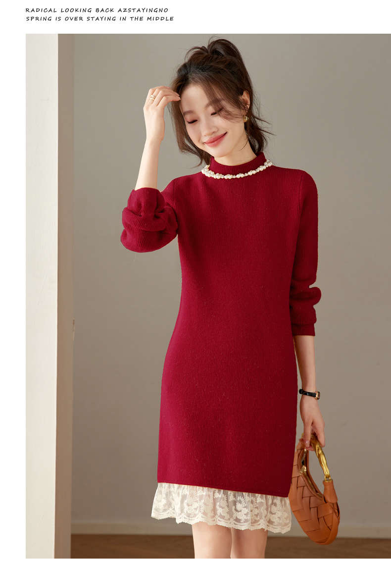 QL-8938蕾丝拼接针织打底连衣裙女秋冬中长款钉珠加厚配大衣内搭毛衣裙子