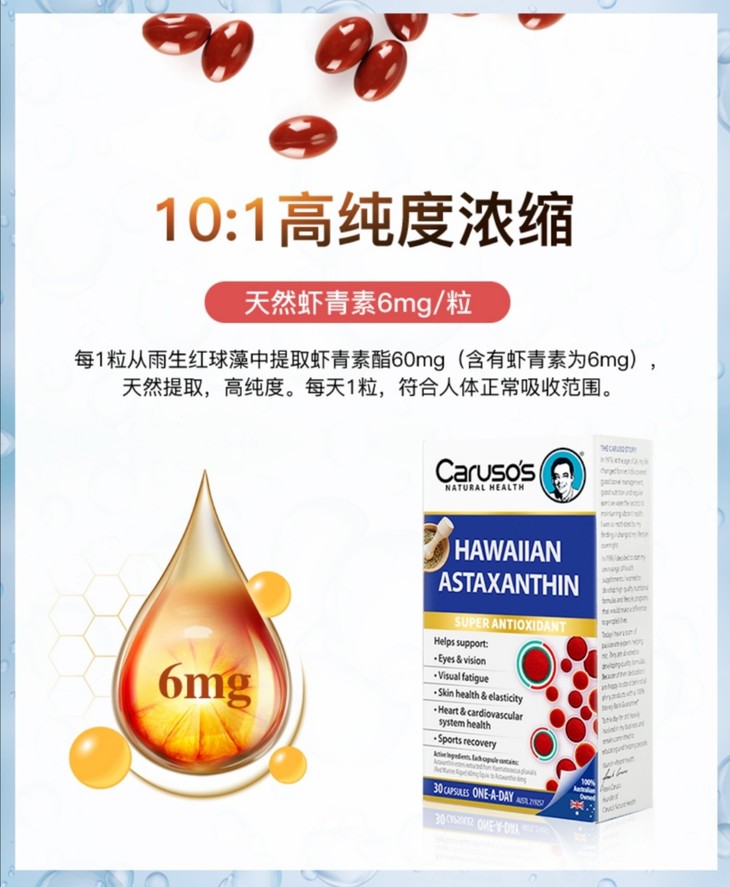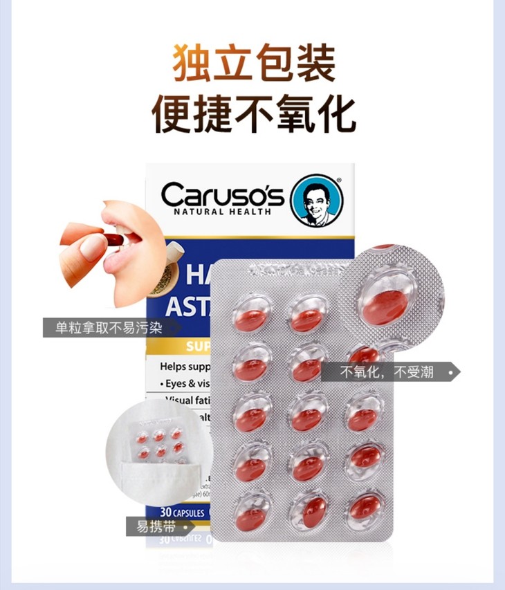 现货~Caruso's虾青素天然雨生红球藻软胶囊30粒