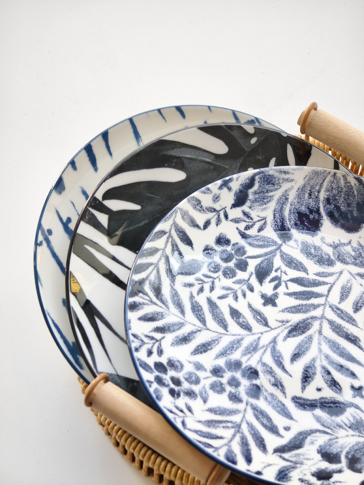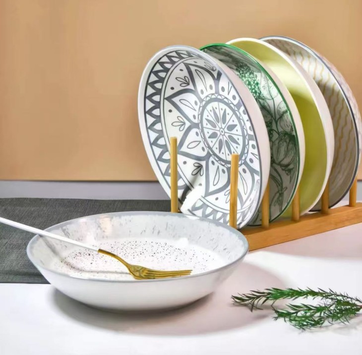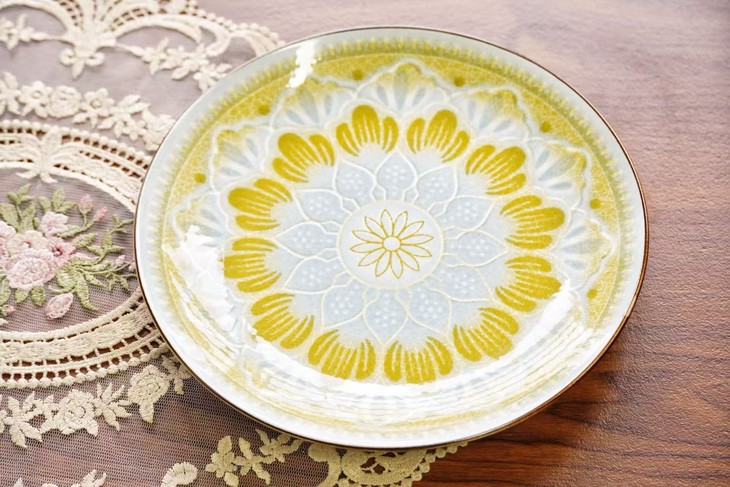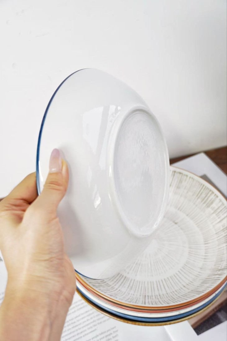 🔺釉下彩工艺 釉下彩餐具的安全性高,彩料被釉料封层包裹,不与食物直接接触 而且釉面更为柔和,更能释出温润细腻的质感,表面更加光滑 色彩保持完好,安全无毒 抗腐蚀也耐磨损 容易清洗 🔹餐具底部边缘不上釉为防滑设计,不影响正常使用