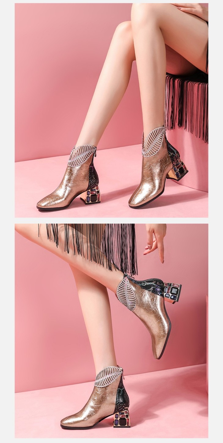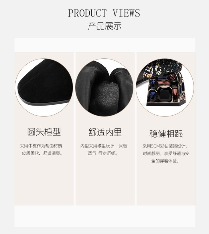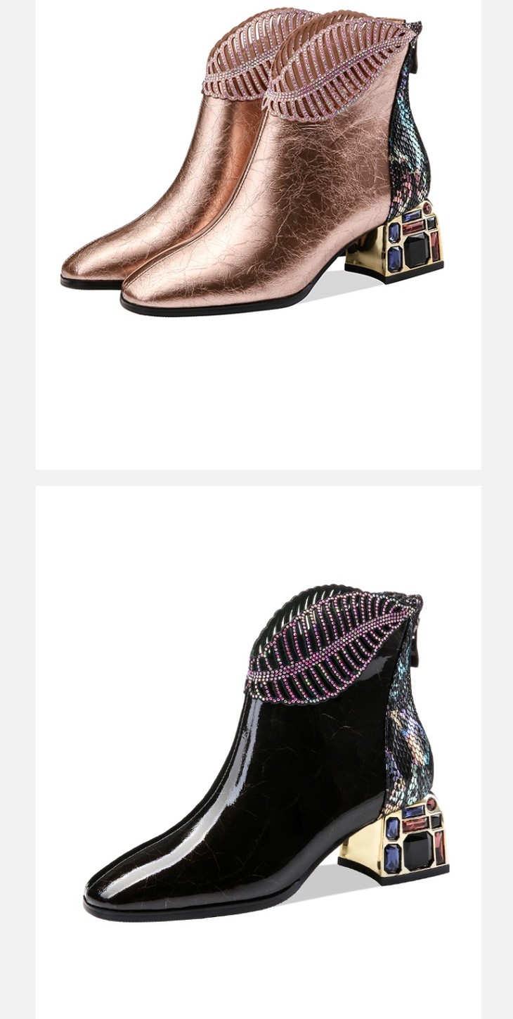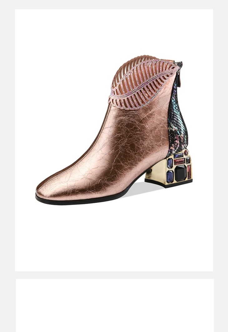短靴女新款单靴百搭中跟粗跟水钻金色女士皮鞋女裸靴 JZX101-162