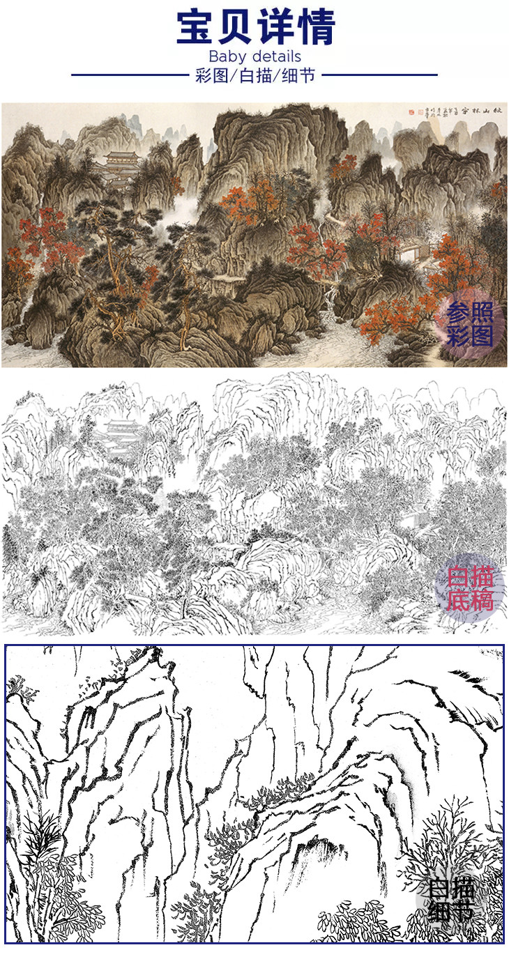 刘彦水横幅工笔山水白描底稿-《秋山林宇》-多种白描尺寸可选-LQ20