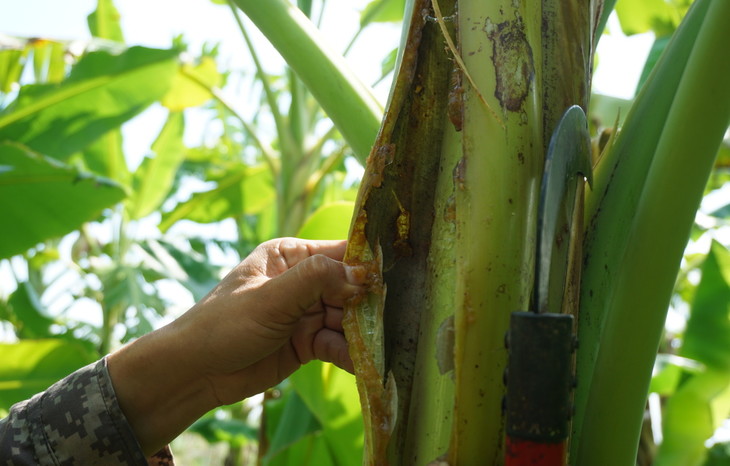 年初粉蕉受冻害以后,砍掉相当多的叶子,使用石硫合剂杀菌。