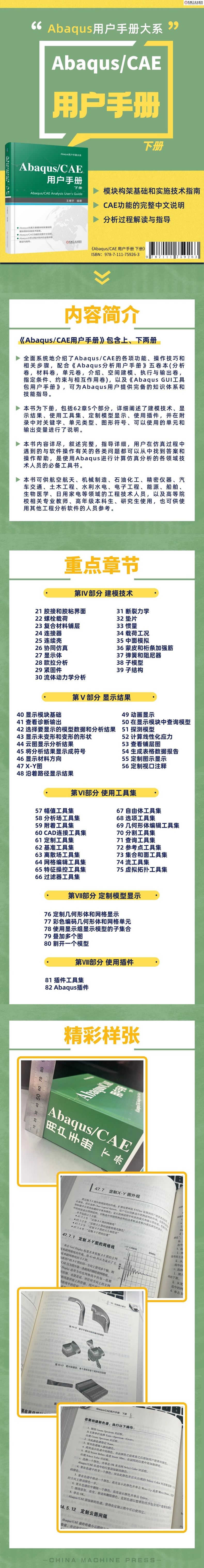 《Abaqus/CAE用户手册》上、下两册可以共同使用,也可分别使用。是Abaqus/CAE功能的完整中文说明。内容系统全面,查询便捷。