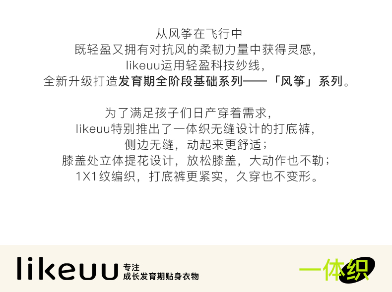- likeuu是专注于为6~15岁的青少年创造柔软、无束缚的成长体验,以好奇心为灵感的成长发育期贴身衣物品牌。likeuu的产品覆盖内衣、内裤、保暖衣、家居服、运动等品类。