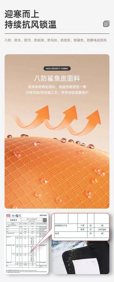 7.面层采用八防鲨鱼皮面料,具备八防:防水防污防液态污,防勾丝防起球防变型防退色防风