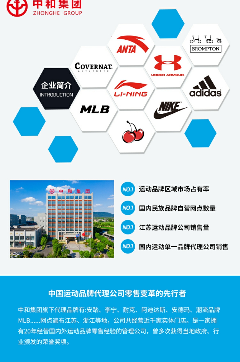 - 中和集团旗下代理安踏、李宁、耐克、安德玛、耐克、中国李宁、MIB等运动时尚品牌,网点遍布江苏、浙江、湖北等身份