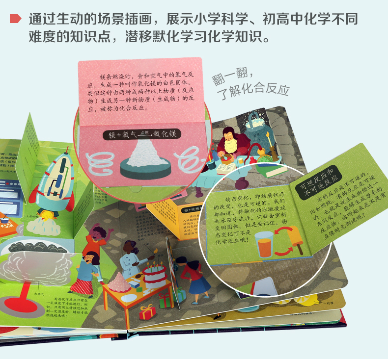 在日常生活中,处处都有化学!本书通过翻翻页的有趣形式,深入浅出地介绍了系统全面的化学知识,其中不乏有趣的化学小实验。从微观到宏观依次介绍原子、分子、元素、物质、化学反应、化工生产、化学发展史等方面的知识,包含小学科学、中学化学不同难度的知识点,帮助孩子做好化学启蒙,克服对化学的畏难情绪,从化学的视角重新认识世界!