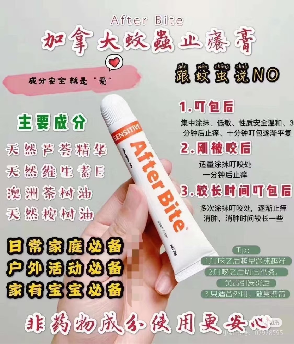 看《花少》里宋祖儿在非洲被狒狒咬了,当地的饲养员就是给她涂了这个,消毒止痒![Laugh]AfterBite止痒膏是北美每个家庭的夏日必备!❤️1⃣️可迅速缓解蚊虫叮咬后所引起的疼痛、发痒、红肿等各种不适。2⃣️被蚊虫叮咬后,只需涂抹少量药膏很快就可止痒,而且红肿也会很快消失,成分自然安全。3⃣️适合敏感肌肤使用。4⃣️不仅是蚊子叮咬,包括蜜蜂,跳蚤,苍蝇,牛虻,蜱虫····等等各种虫子叮咬都瞬间解毒止痒!两岁以上成人均可使用~连续畅销25年
