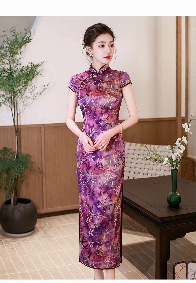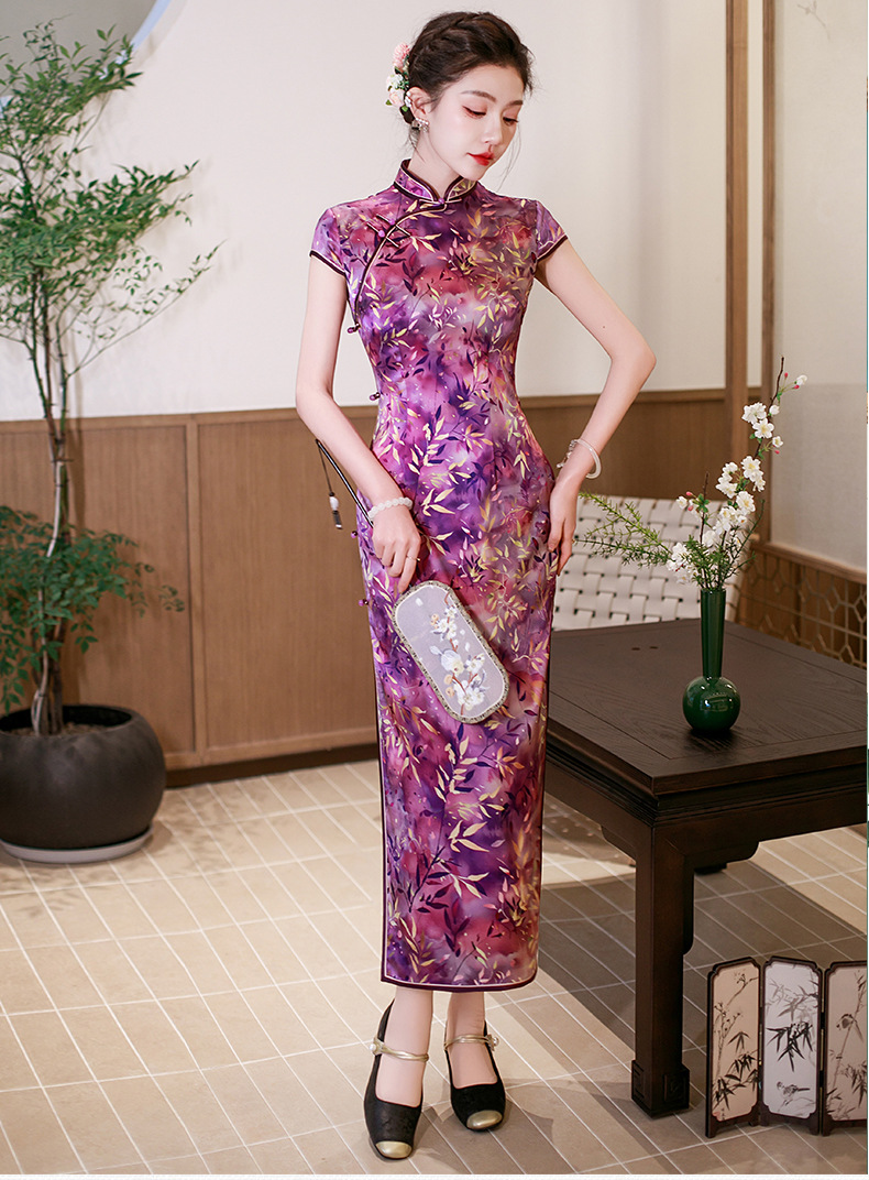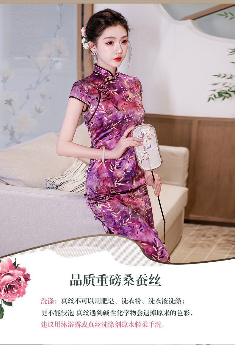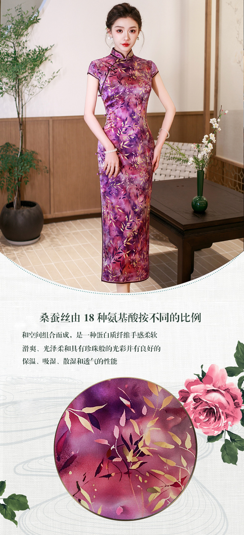 WX2026新款真丝旗袍紫色长款改良中式桑蚕丝连衣裙优雅气质修身复古