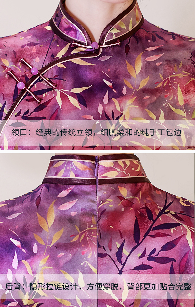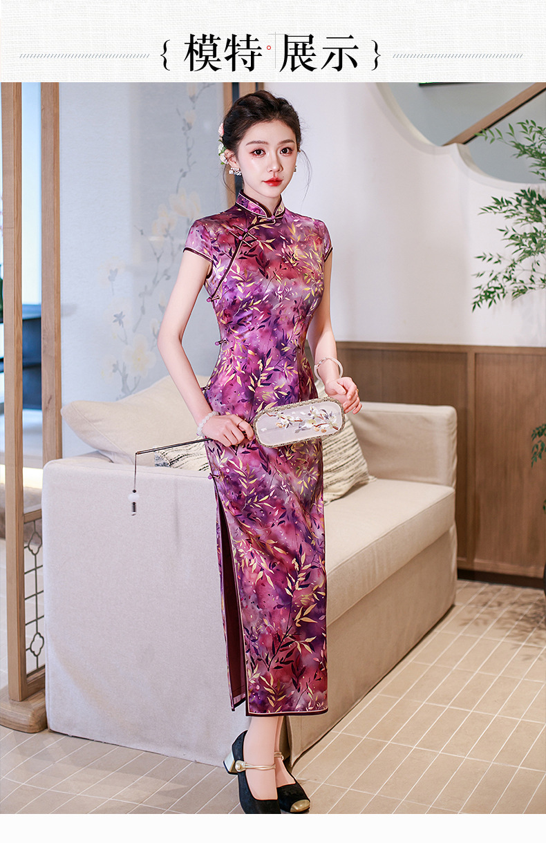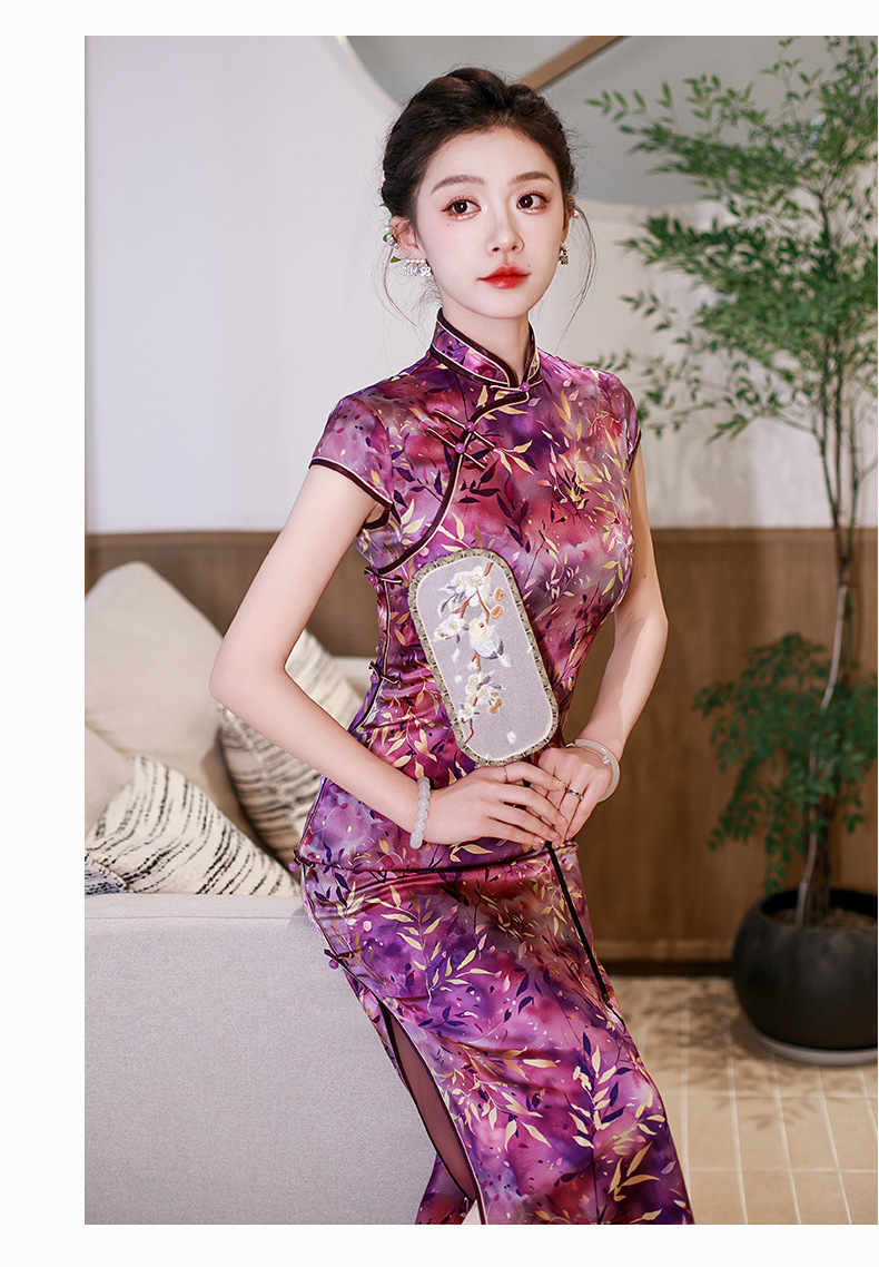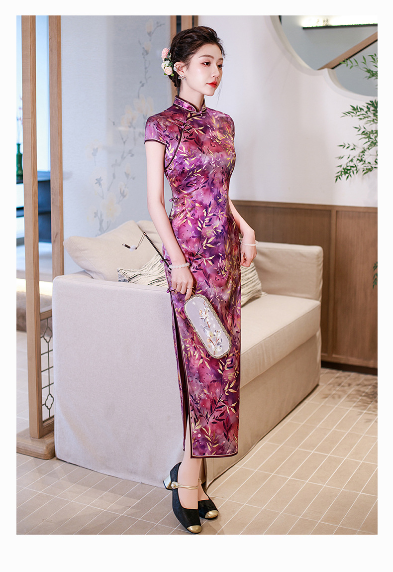 WX2026新款真丝旗袍紫色长款改良中式桑蚕丝连衣裙优雅气质修身复古