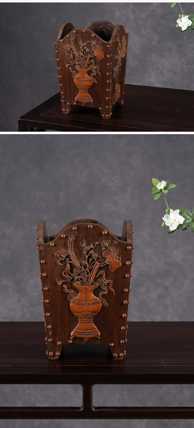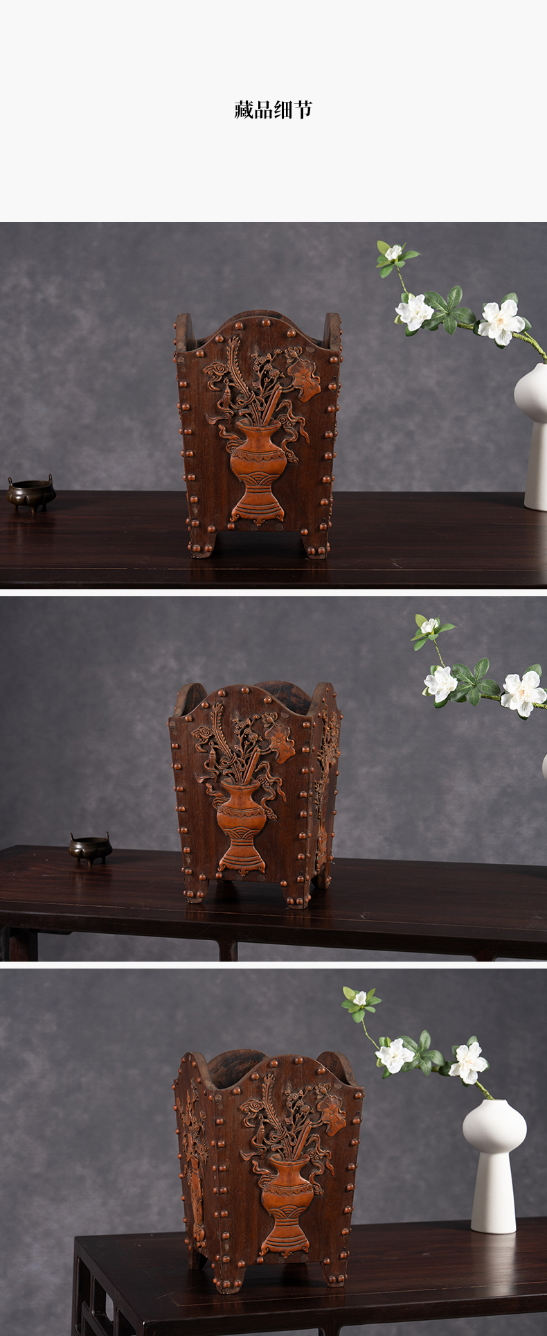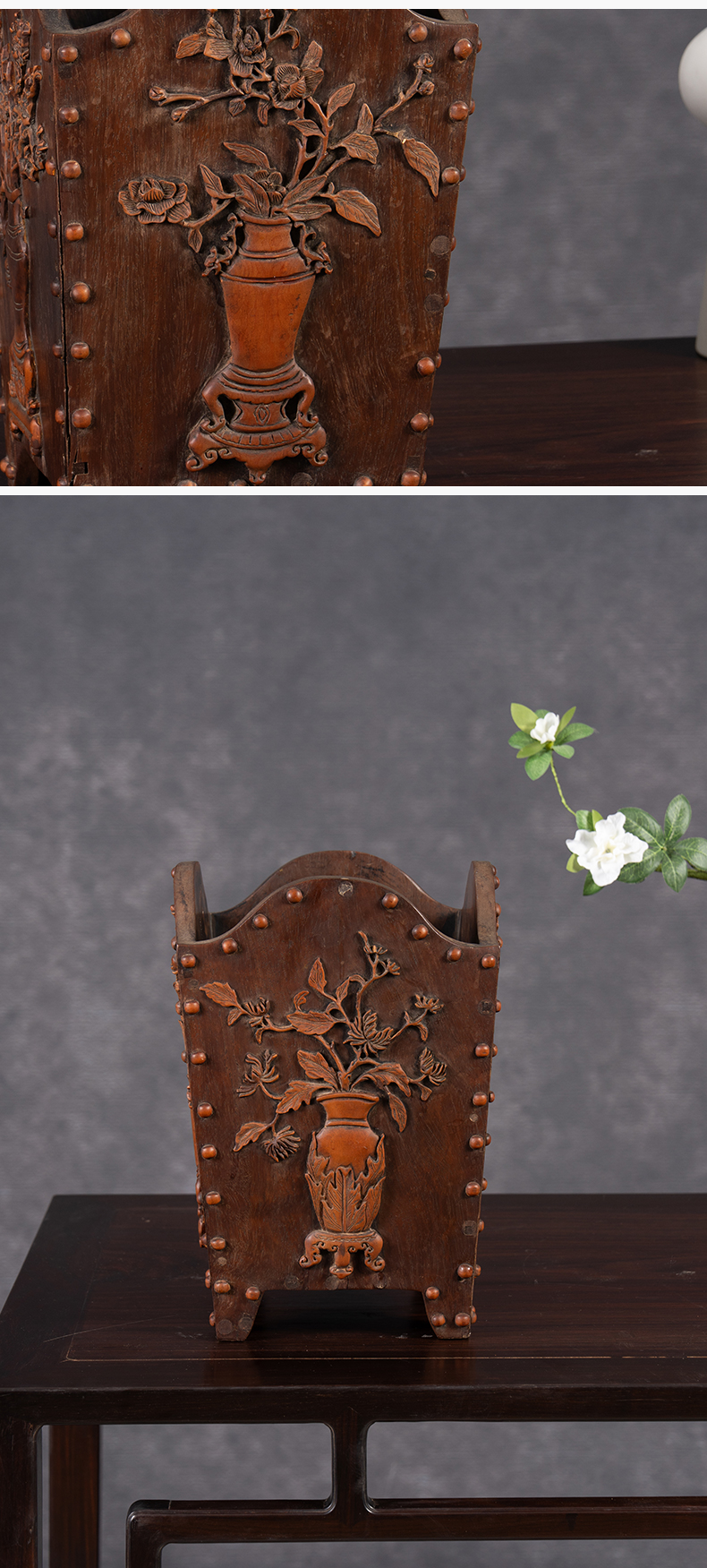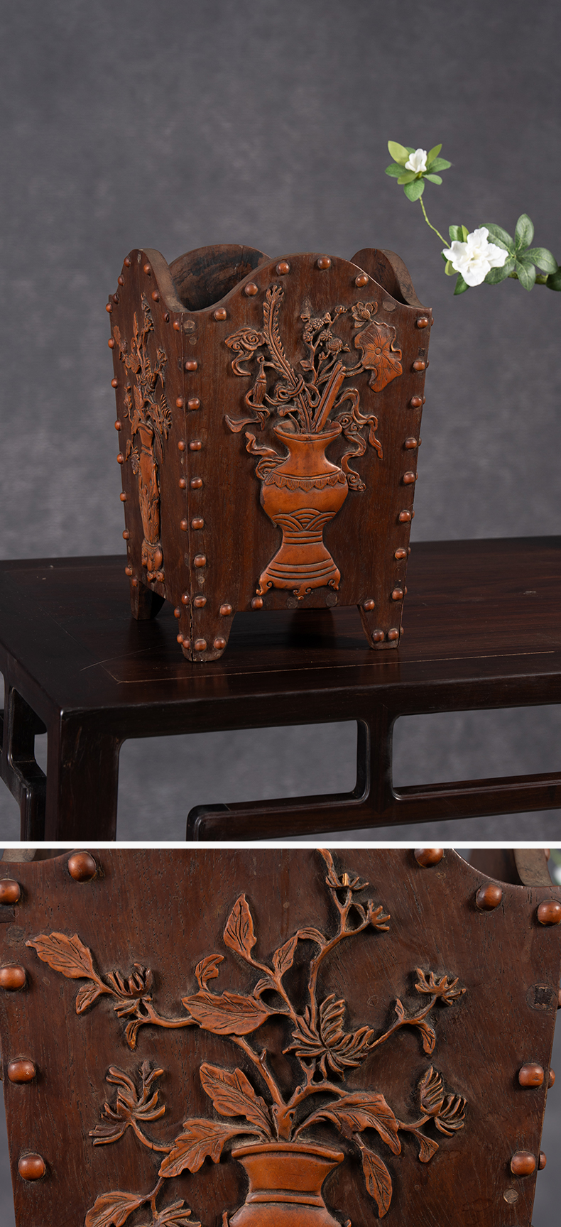 清 红木嵌黄杨木博古清供图箭筒