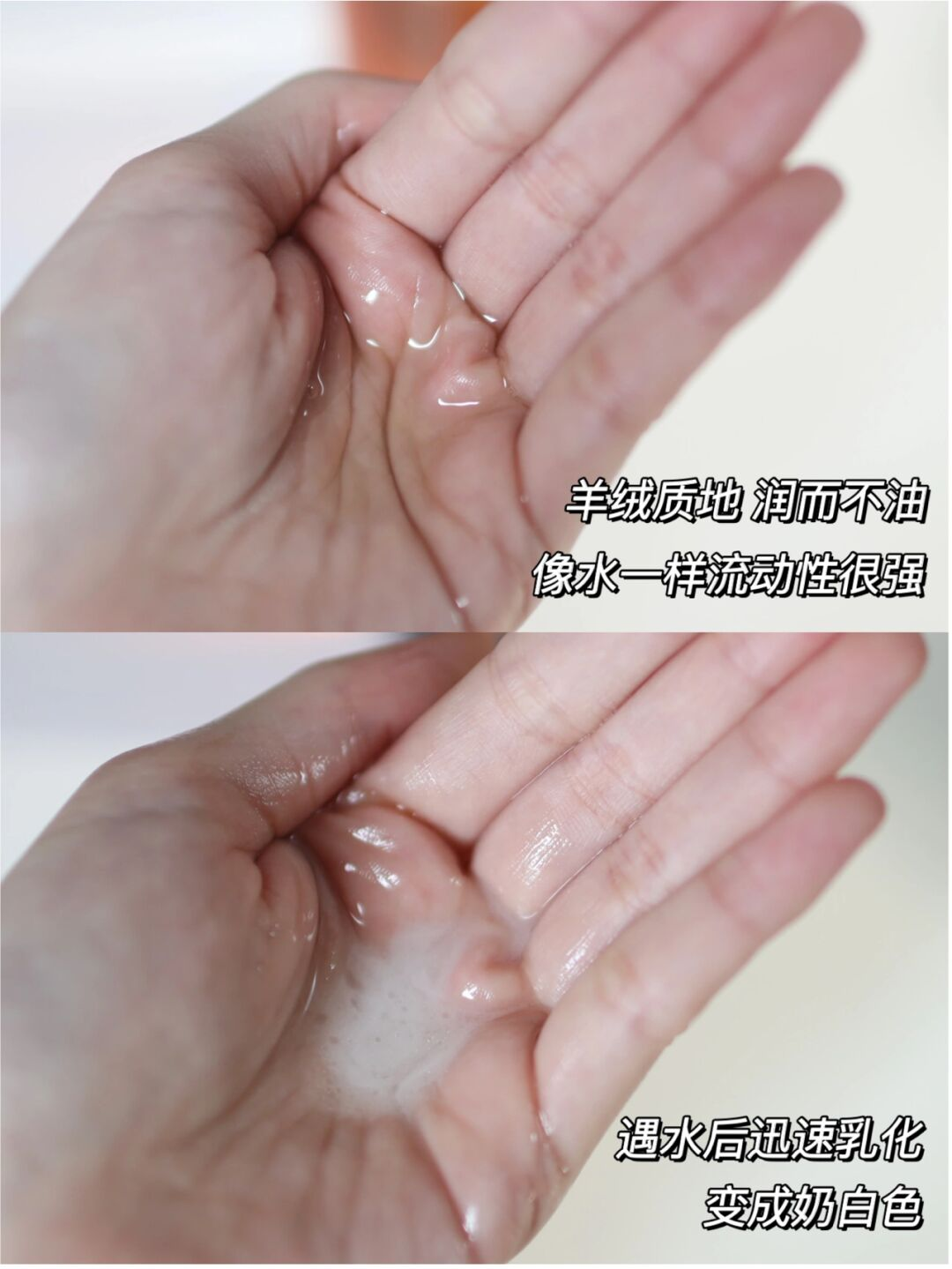 它是那种润而不油的,流动性很强,一倒出来就顺溜地从手上流下去,没有啥油膜感~